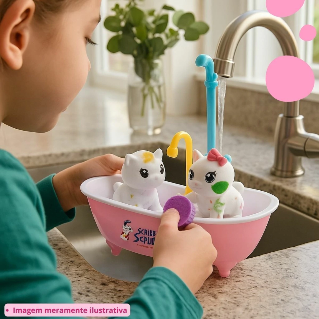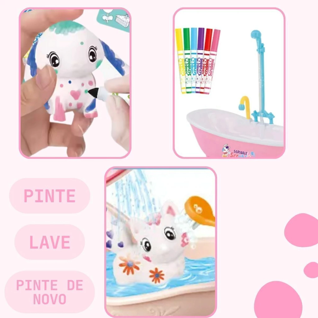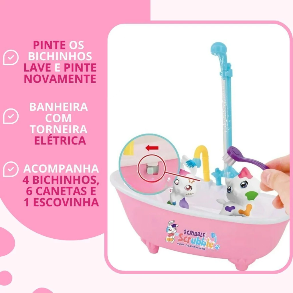 O Kit Banho Criativo traz uma mini banheira com torneira funcional, acompanhada de quatro adoráveis bichinhos para pintar, lavar e repetir quantas vezes quiser! As crianças podem usar a imaginação para colorir os pets com as canetinhas inclusas e, em seguida, dar um banho neles com a escovinha e água de verdade.