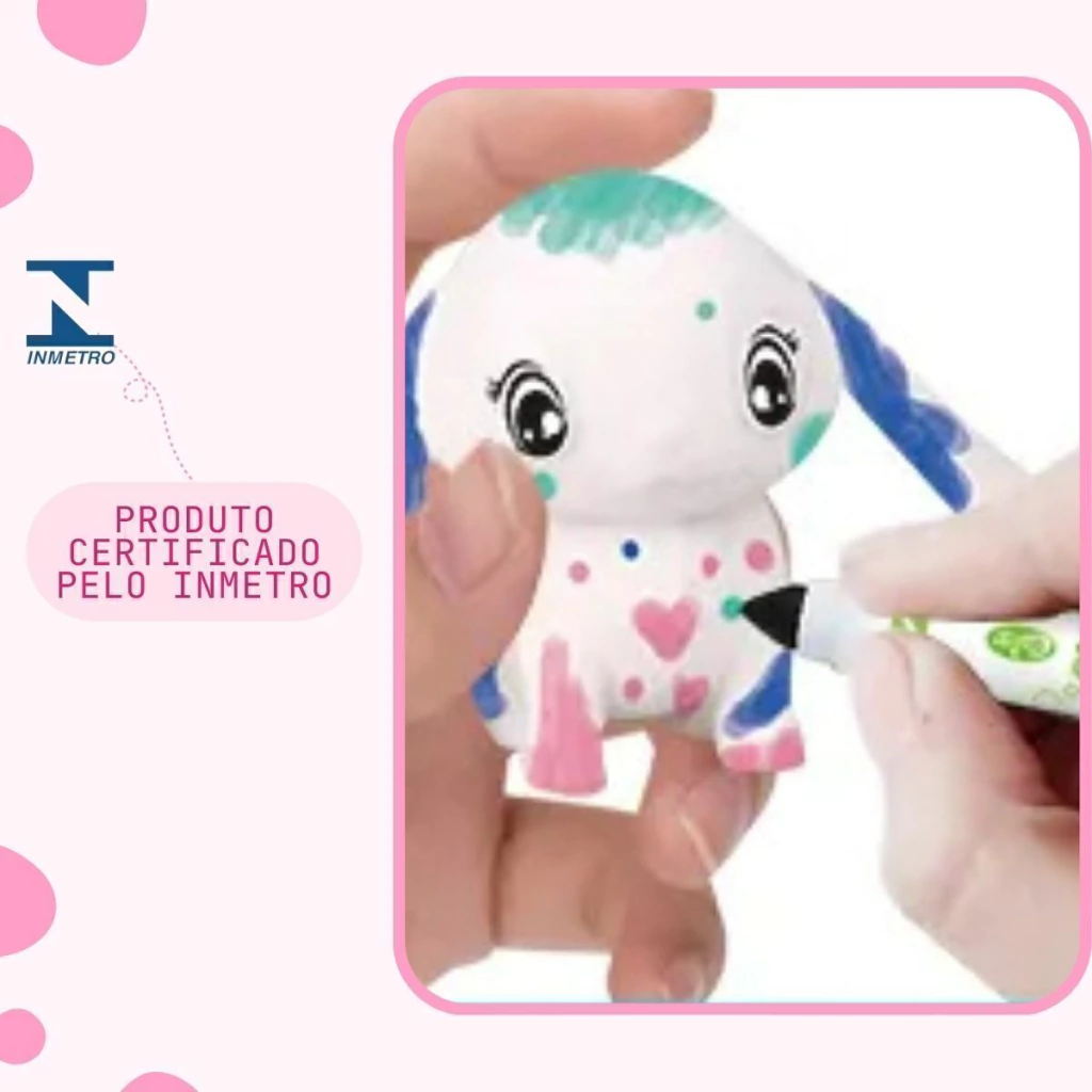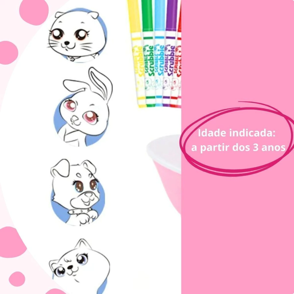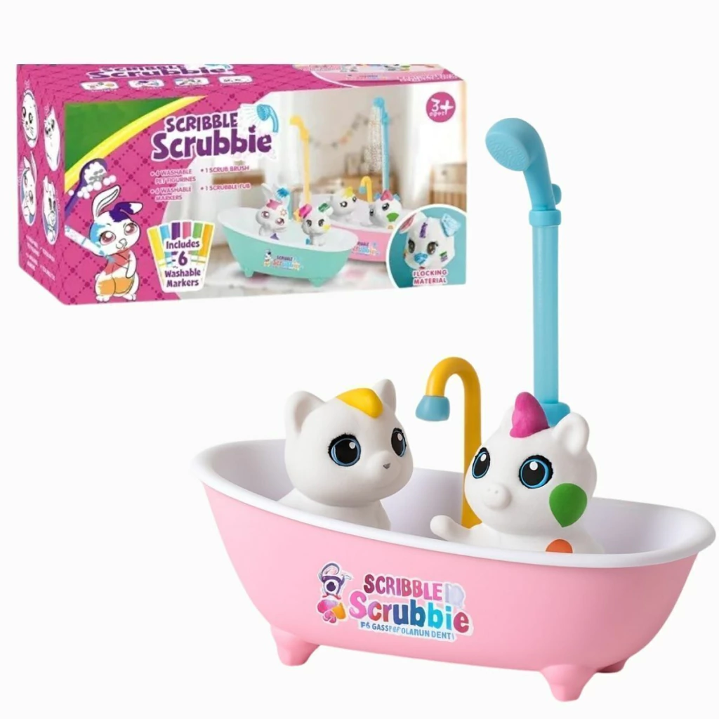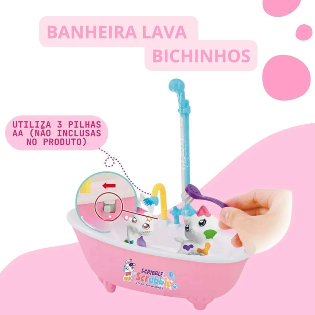 O Kit Banho Criativo traz uma mini banheira com torneira funcional, acompanhada de quatro adoráveis bichinhos para pintar, lavar e repetir quantas vezes quiser! As crianças podem usar a imaginação para colorir os pets com as canetinhas inclusas e, em seguida, dar um banho neles com a escovinha e água de verdade.