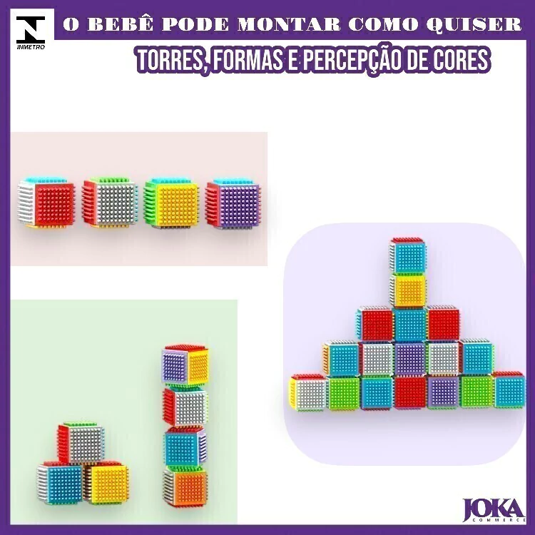 Como Usar: Coloque os blocos à disposição do bebê e incentive-o a empilhar, combinar e explorar as diferentes texturas e cores. Você também pode participar da brincadeira, mostrando como construir pequenas torres e derrubá-las, promovendo a interação e o aprendizado.