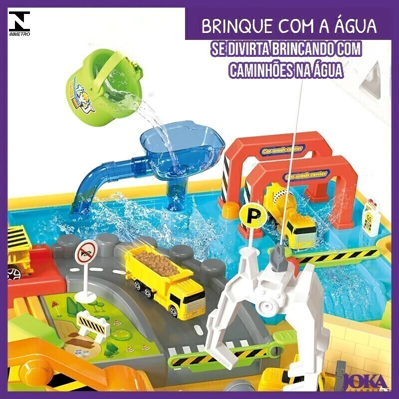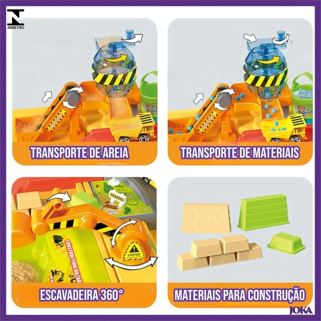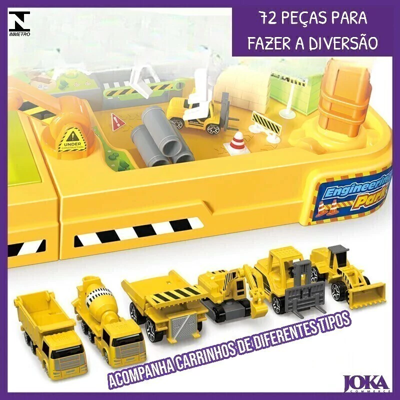 - Inclui miniaturas de veículos de construção: escavadeira, caminhão basculante, guindaste, entre outros;