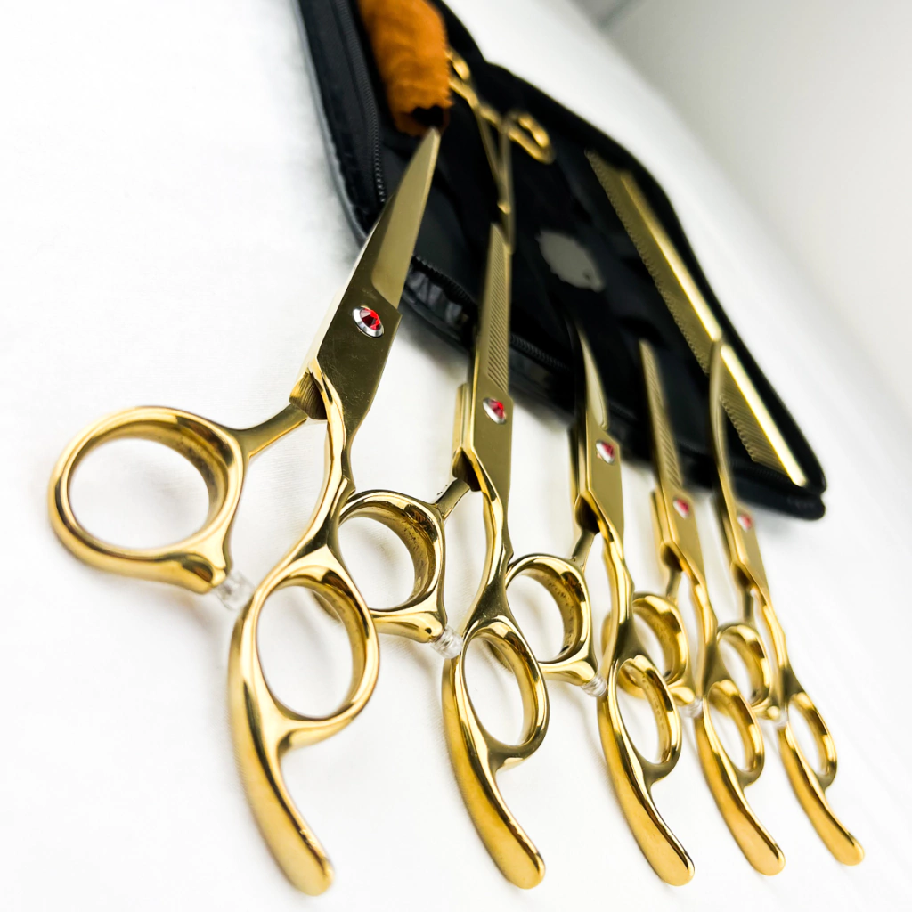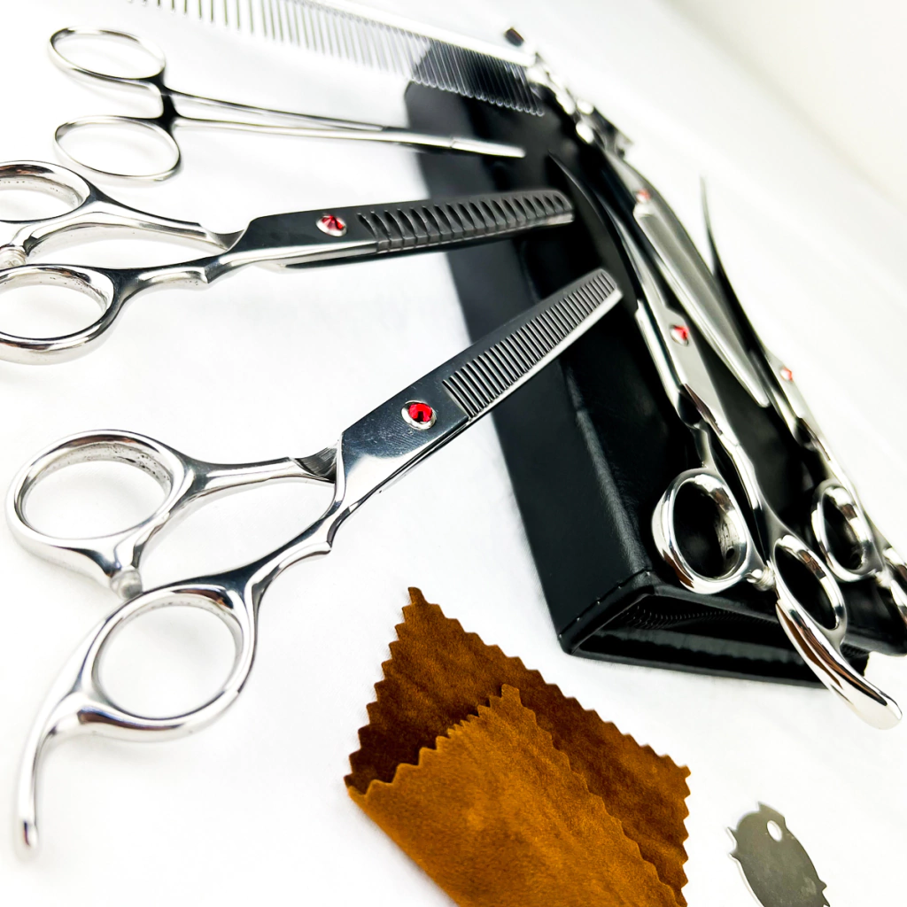 Cada conjunto vêm com cinco tesouras, uma pinça tipo tesoura, um pente, uma chave para regulagem das tesouras e um lindo estojo para proteção e armazenamento feito em couro.