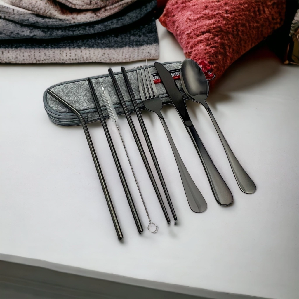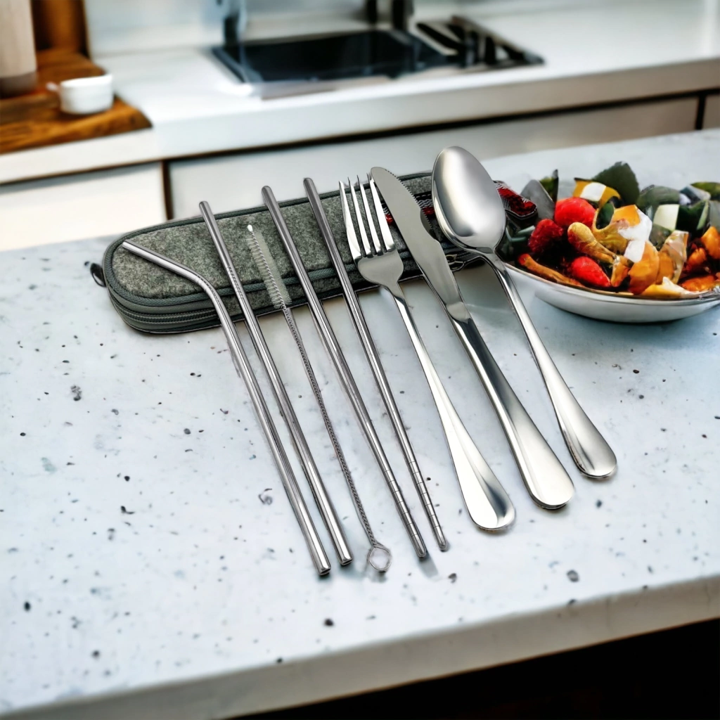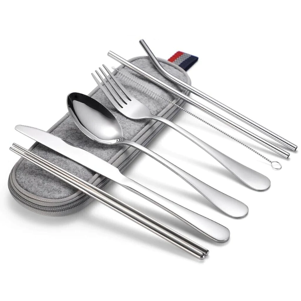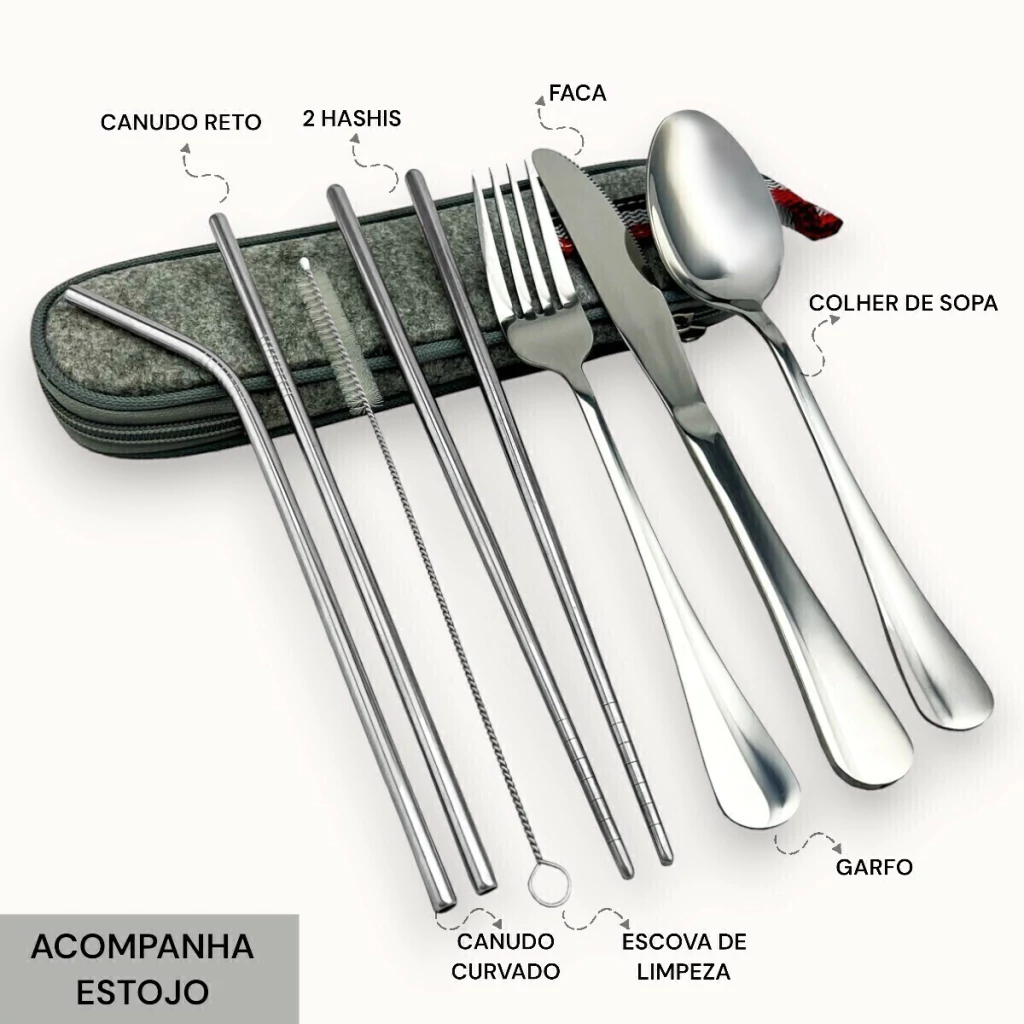 O conjunto de talheres reutilizável feito de inox é perfeito para quem busca praticidade.