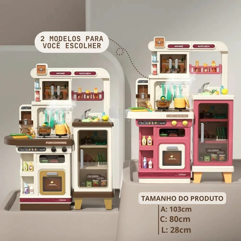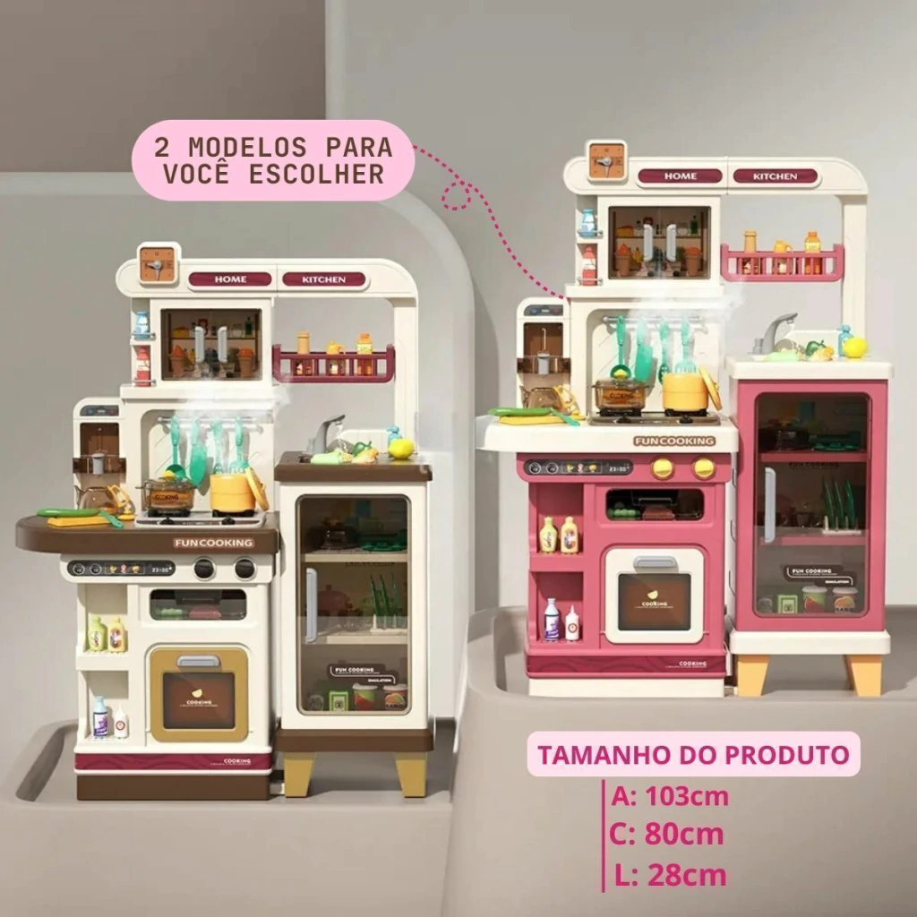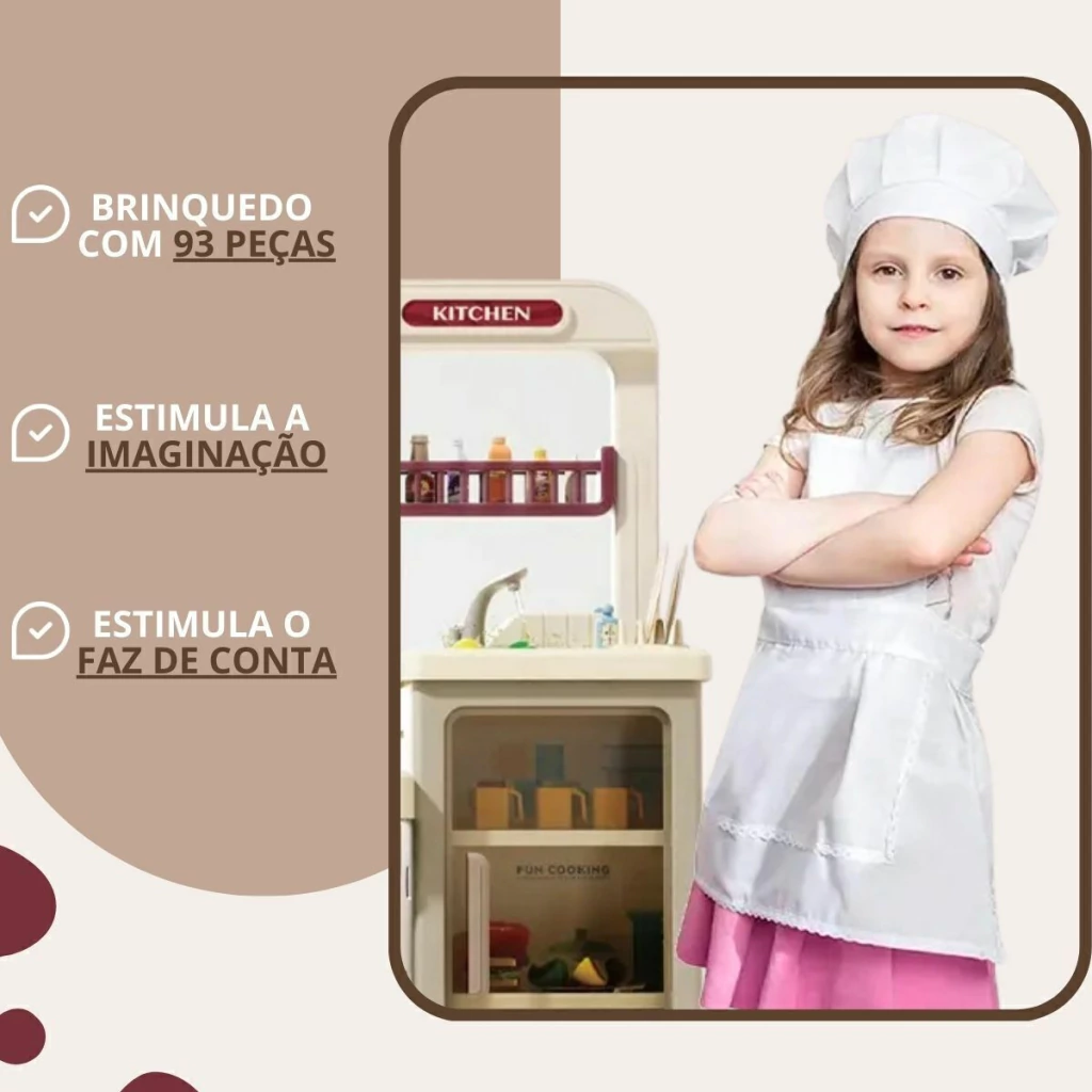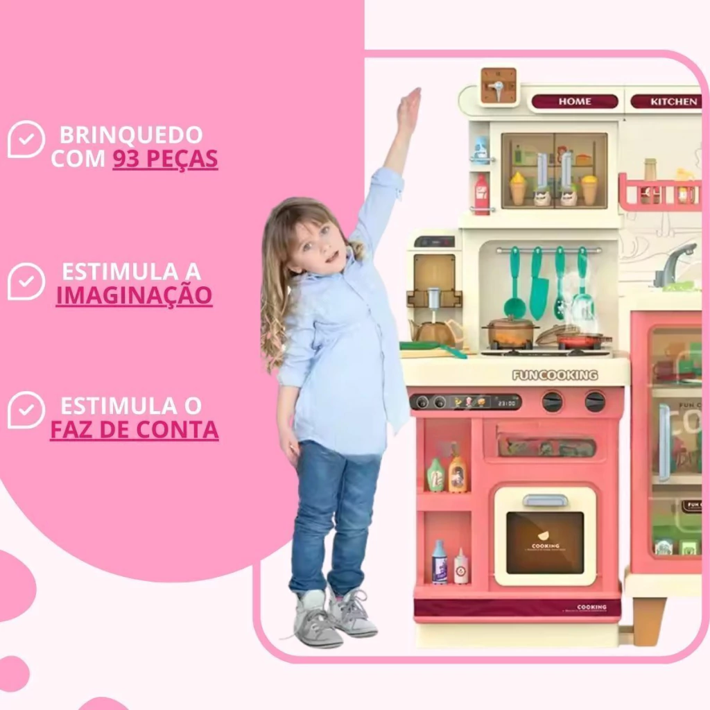 A Cozinha Infantil é o brinquedo perfeito para crianças que adoram aventuras culinárias. Com 103 cm de altura e múltiplos acessórios, ela oferece uma simulação completa de uma cozinha real. A cozinha é equipada com forno, luzes, utensílios de cozinha, pia funcional e o mais legal, o fogão sai vapor de verdade, para deixar a brincadeira ainda mais realista.