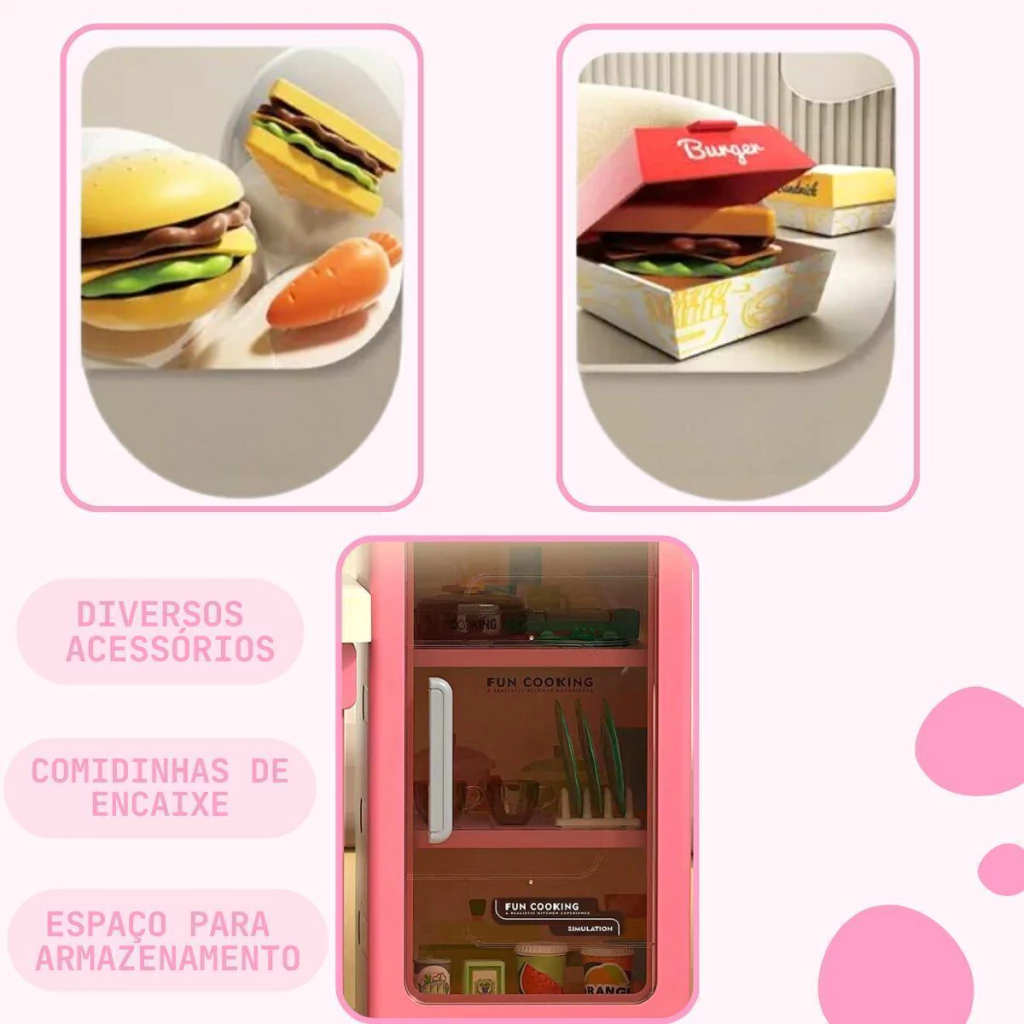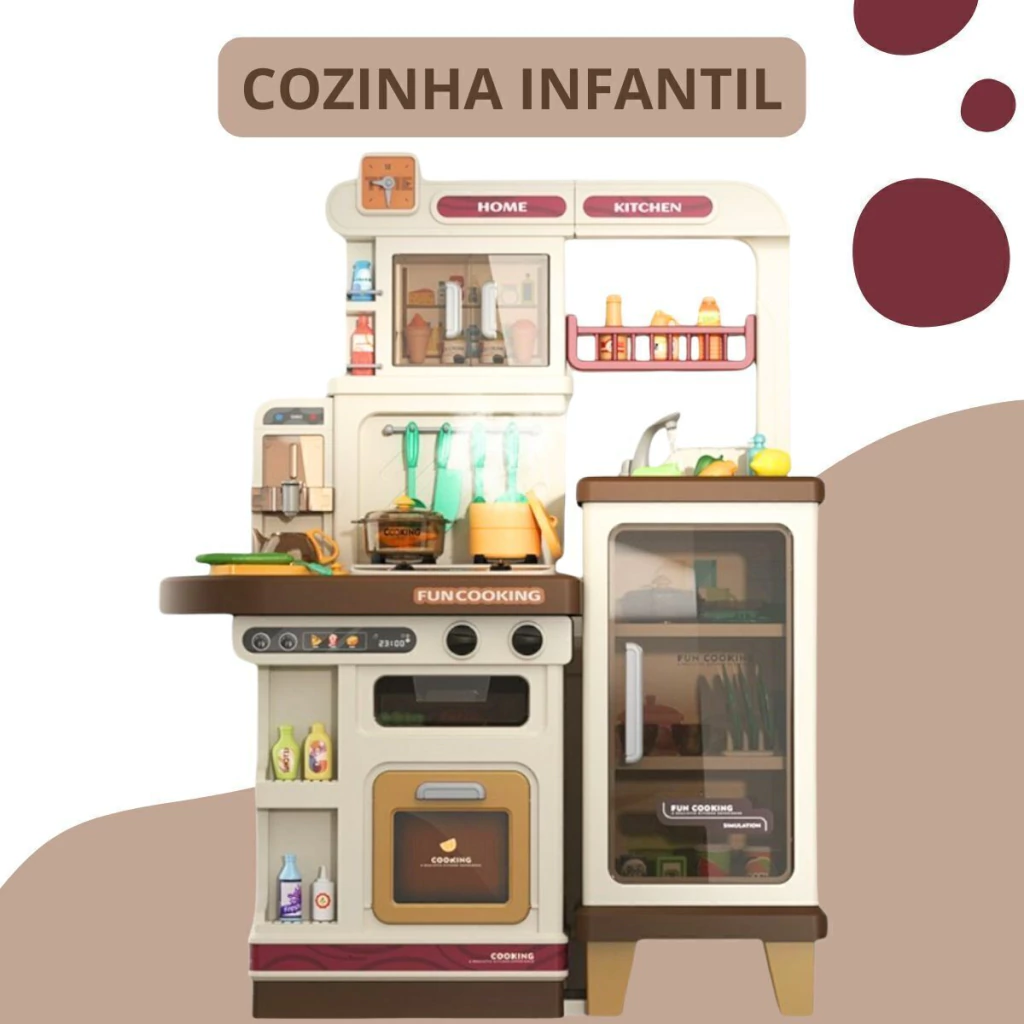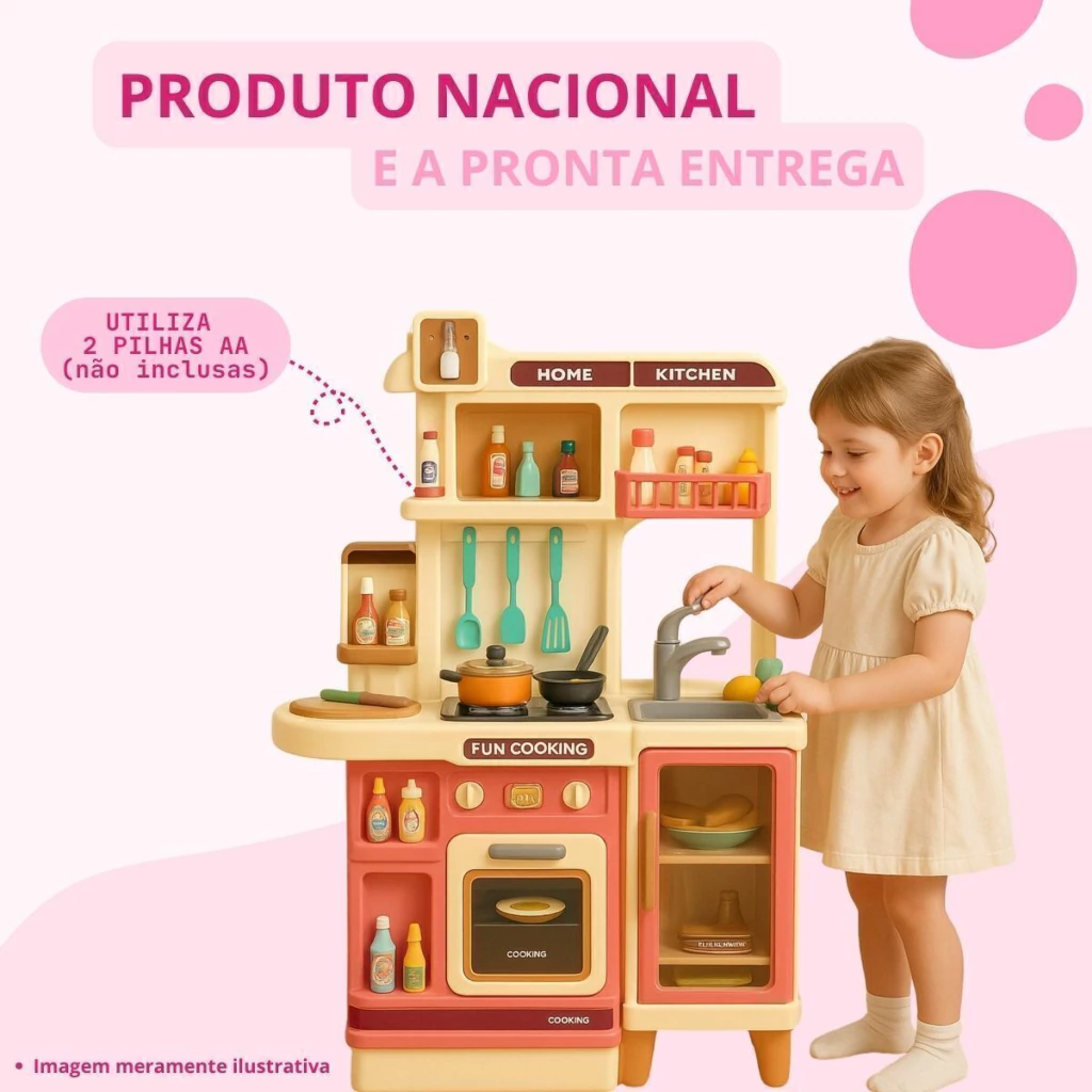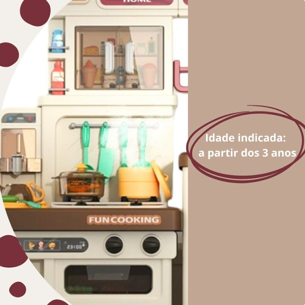 A Cozinha Infantil é o brinquedo perfeito para crianças que adoram aventuras culinárias. Com 103 cm de altura e múltiplos acessórios, ela oferece uma simulação completa de uma cozinha real. A cozinha é equipada com forno, luzes, utensílios de cozinha, pia funcional e o mais legal, o fogão sai vapor de verdade, para deixar a brincadeira ainda mais realista.