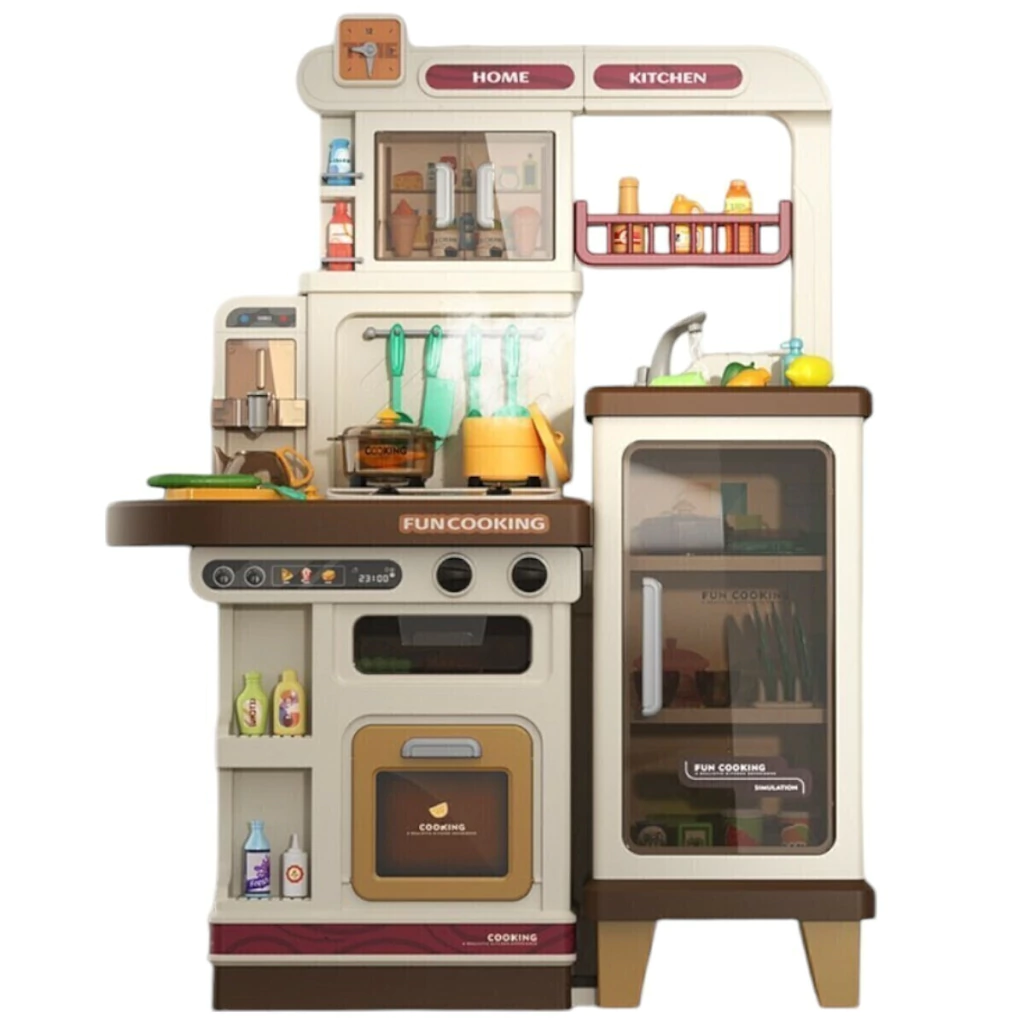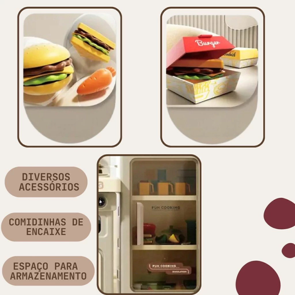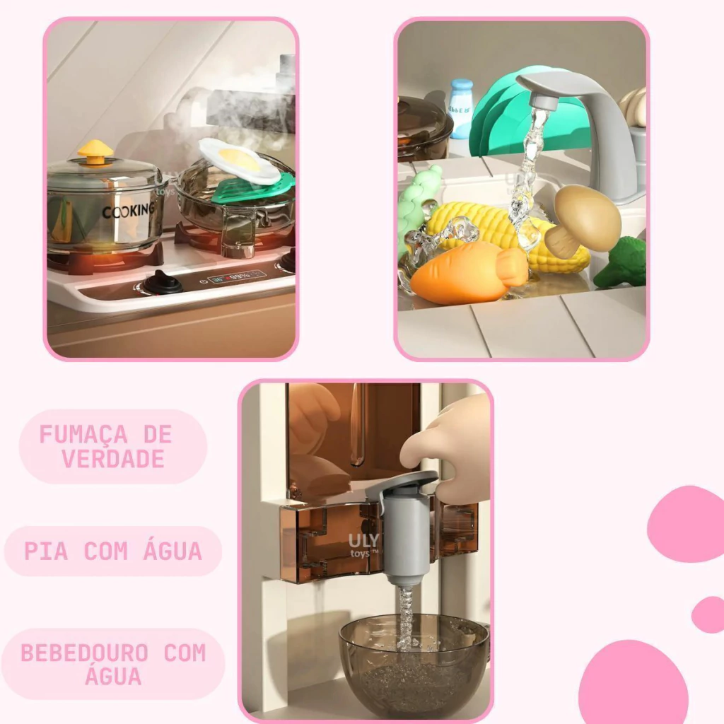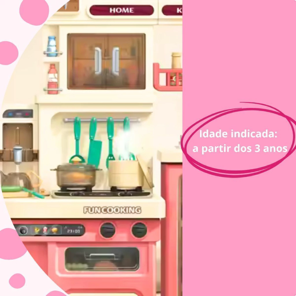 A Cozinha Infantil é o brinquedo perfeito para crianças que adoram aventuras culinárias. Com 103 cm de altura e múltiplos acessórios, ela oferece uma simulação completa de uma cozinha real. A cozinha é equipada com forno, luzes, utensílios de cozinha, pia funcional e o mais legal, o fogão sai vapor de verdade, para deixar a brincadeira ainda mais realista.