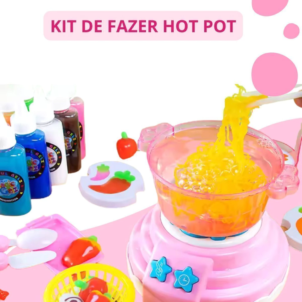 Um conjunto completo que simula uma panela de fondue oriental, com diversos ingredientes para montar sopinhas e caldos deliciosos no mundo do faz de conta.