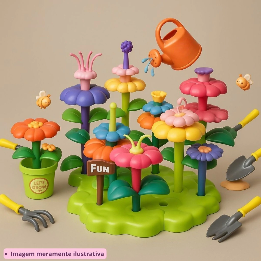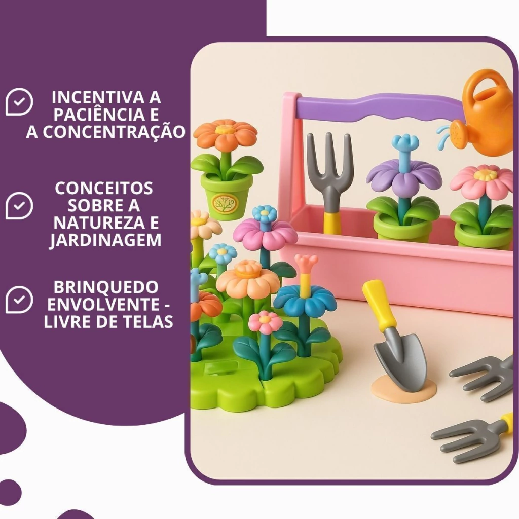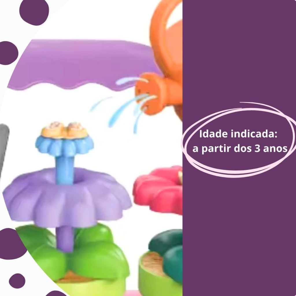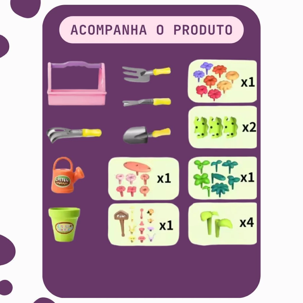O kit acompanha diversos tipos de flores, vasos, bases, pás e ancinhos — tudo feito em plástico resistente e livre de rebarbas. É ideal para brincar sozinho ou com os amigos, dentro de casa ou ao ar livre.