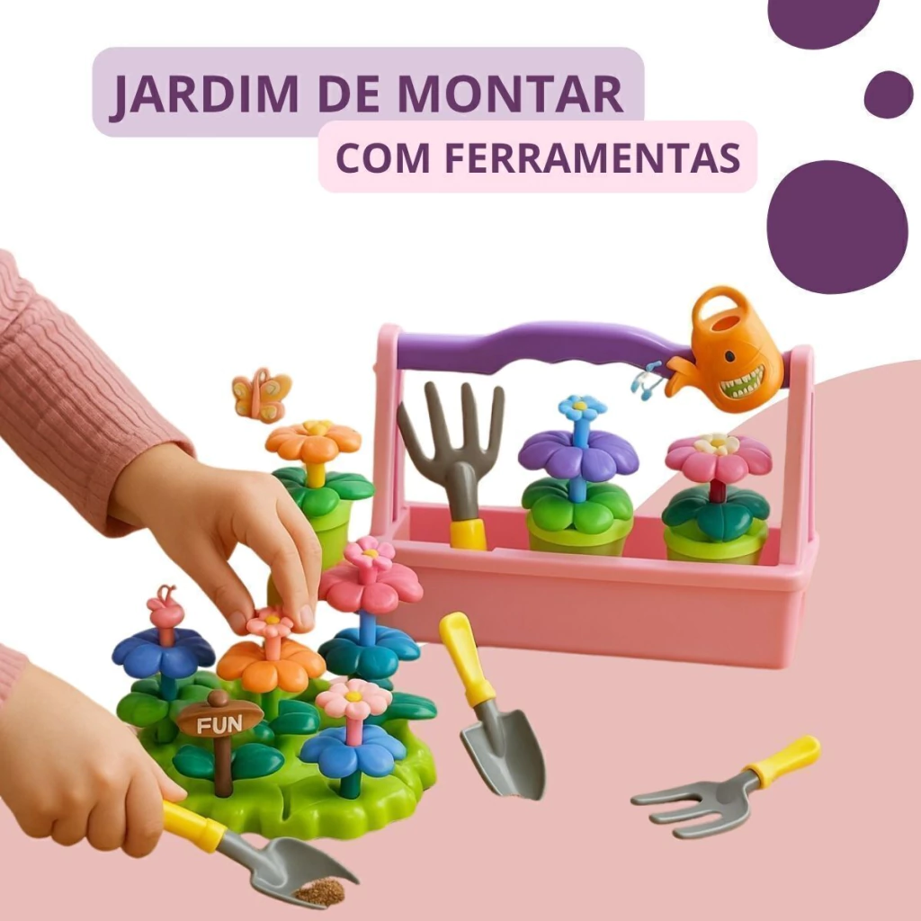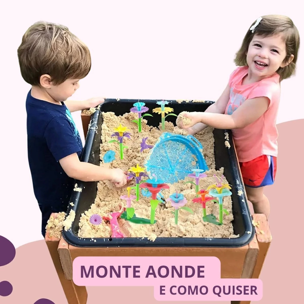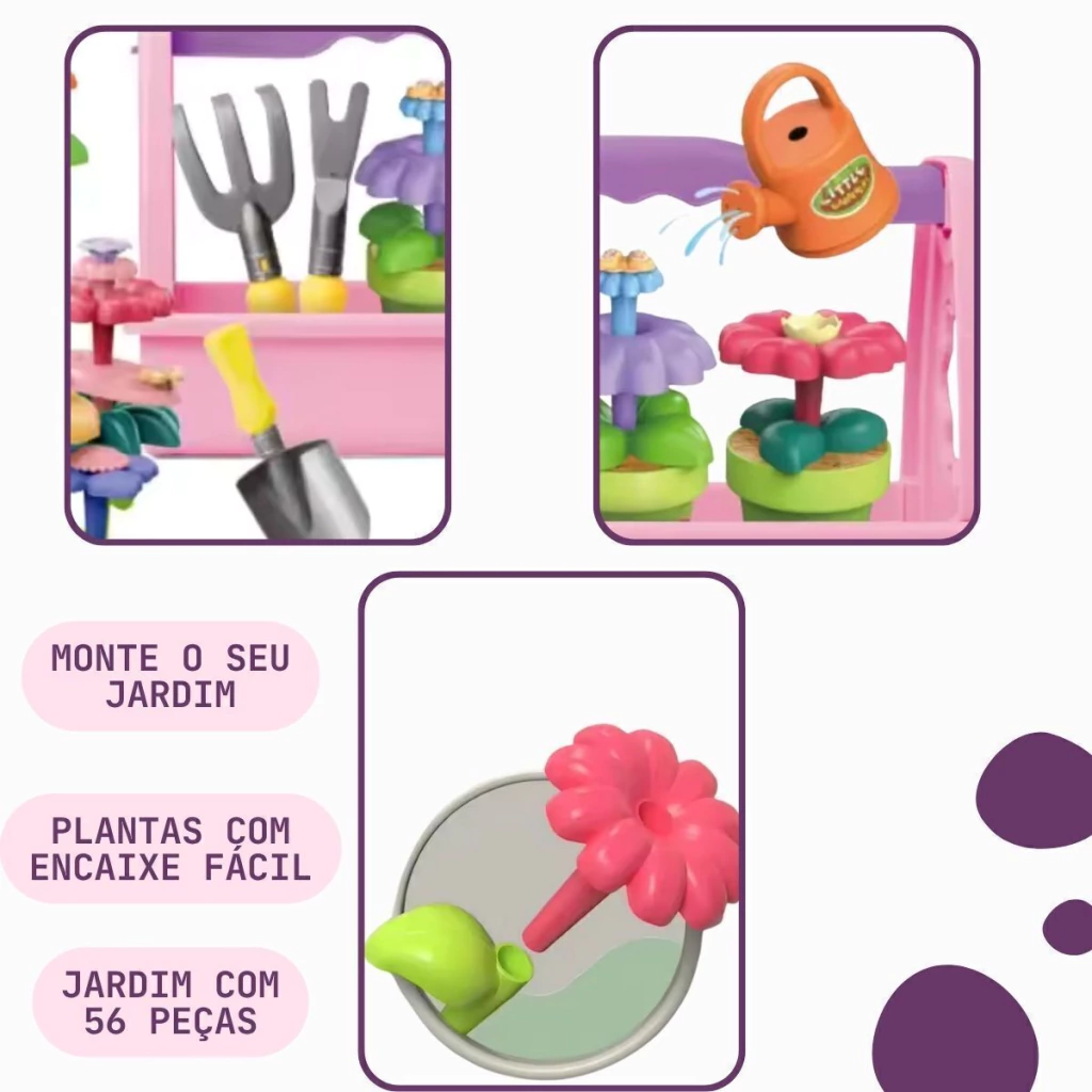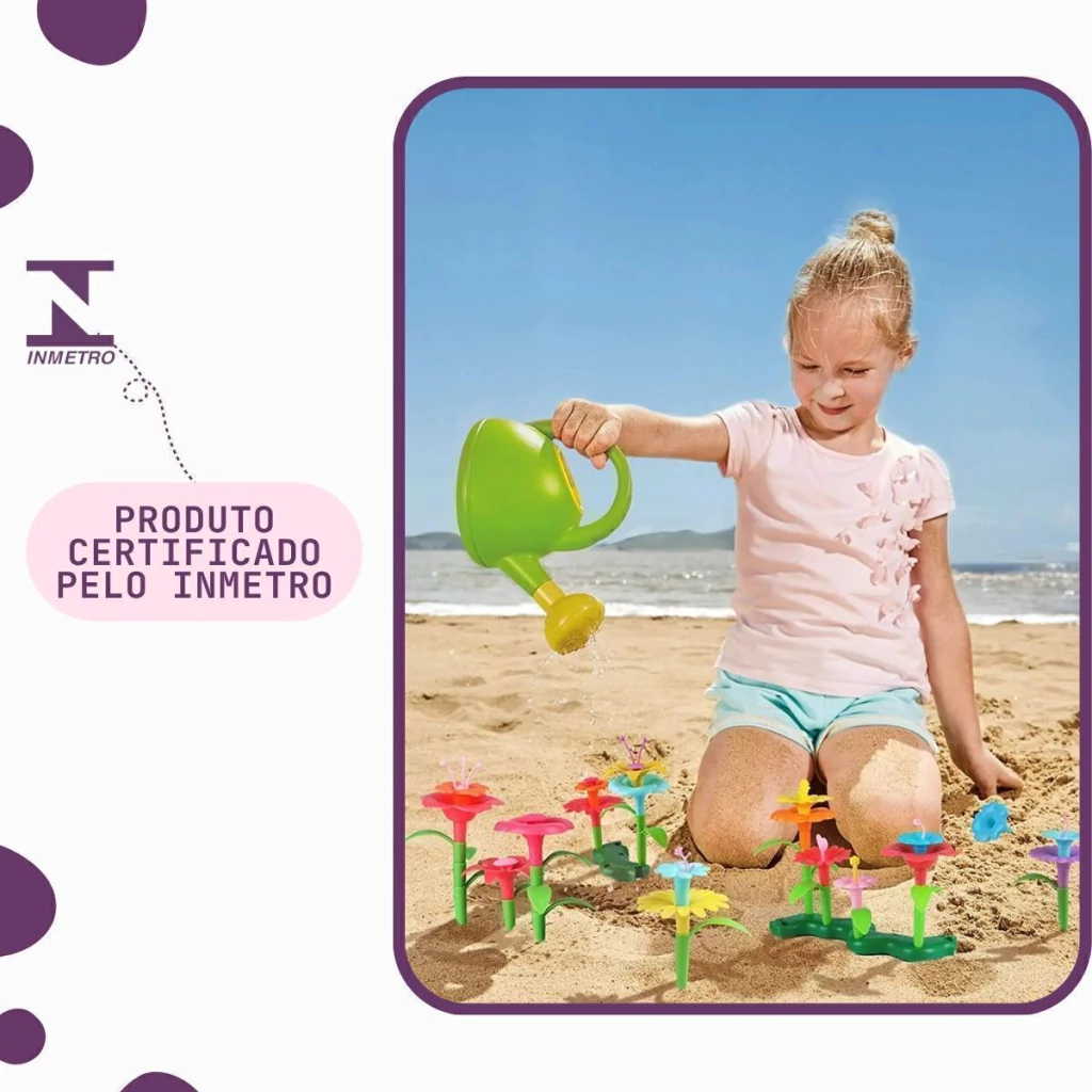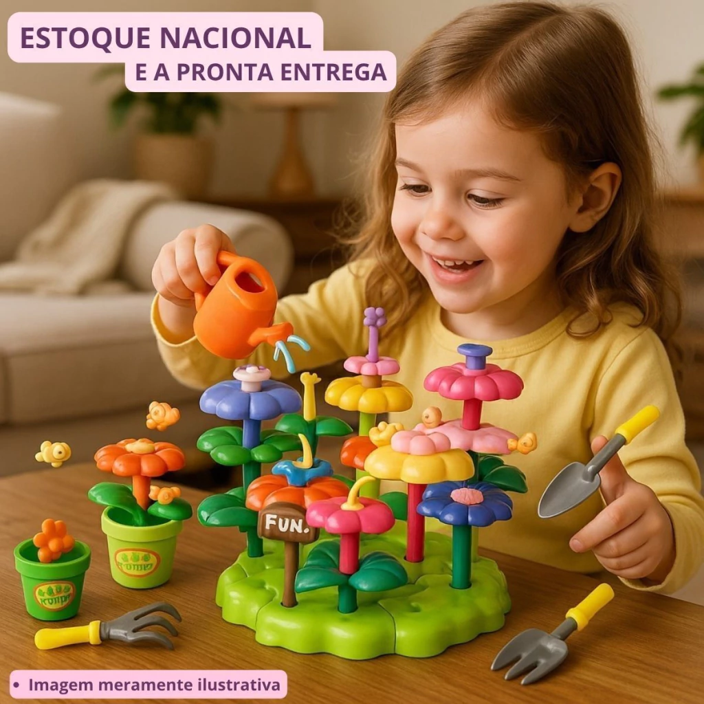 O kit acompanha diversos tipos de flores, vasos, bases, pás e ancinhos — tudo feito em plástico resistente e livre de rebarbas. É ideal para brincar sozinho ou com os amigos, dentro de casa ou ao ar livre.
