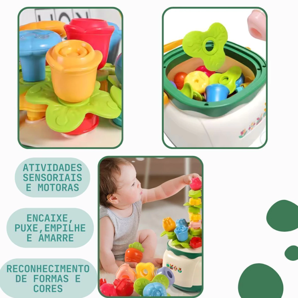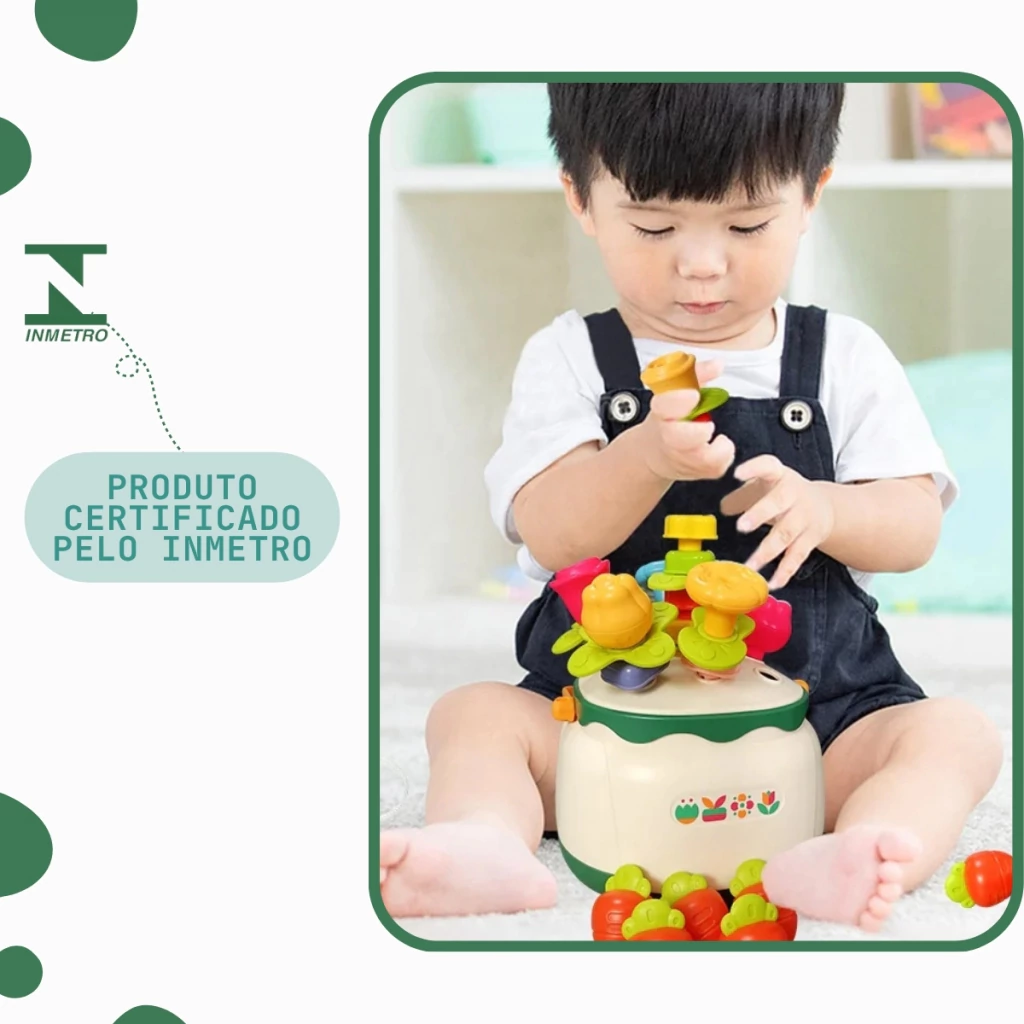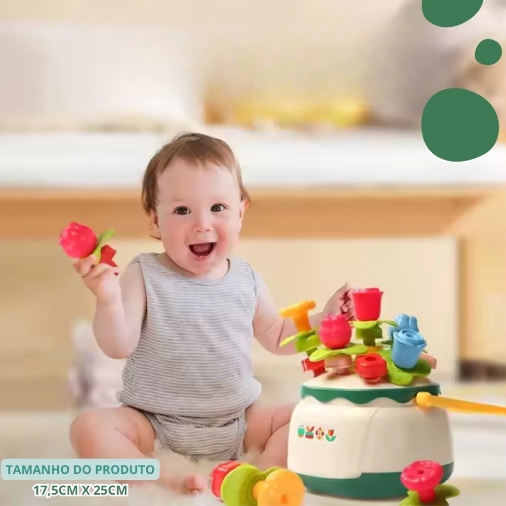 A base imita um vaso e acompanha hastes, folhas e flores para serem montadas livremente. Um brinquedo encantador para trabalhar habilidades motoras, cores e formas com liberdade e segurança!