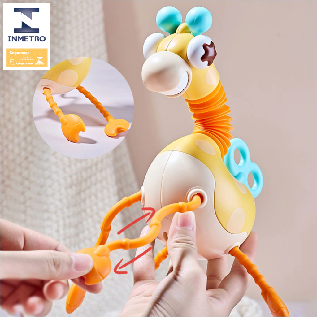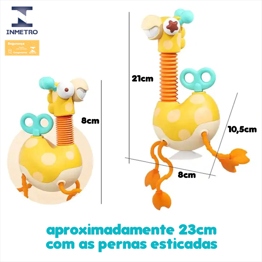 Já a girafinha possui perninhas em silicone, que pode ser colocada na boca e manuseada, além de ir acompanhada de uma ventosa, que pode ser fixada em diferentes lugares, como na cadeira de alimentação e no vidro do carro.