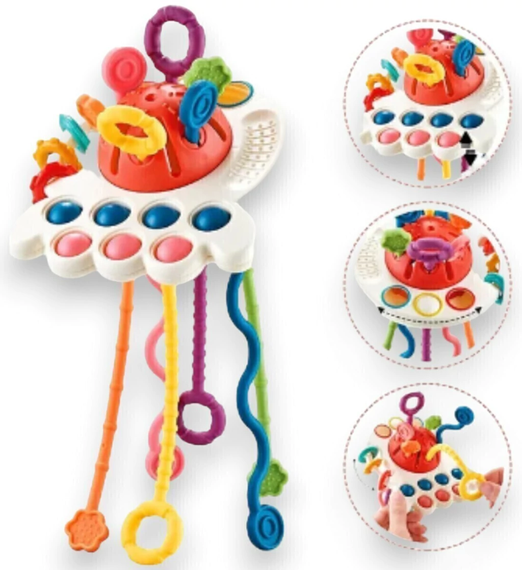 O mordedor em formato de disco voador, possui função de chocalho, bolinhas de apertar e cordinhas em silicone que pode ser utilizada como massageador em fase de dentição.