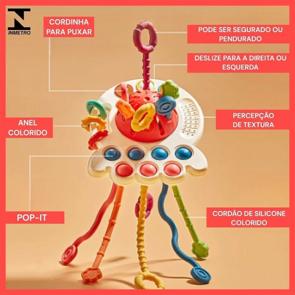 - 4 em 1 = mordedor, chocalho, bolinhas de apertar e cordinhas para puxar