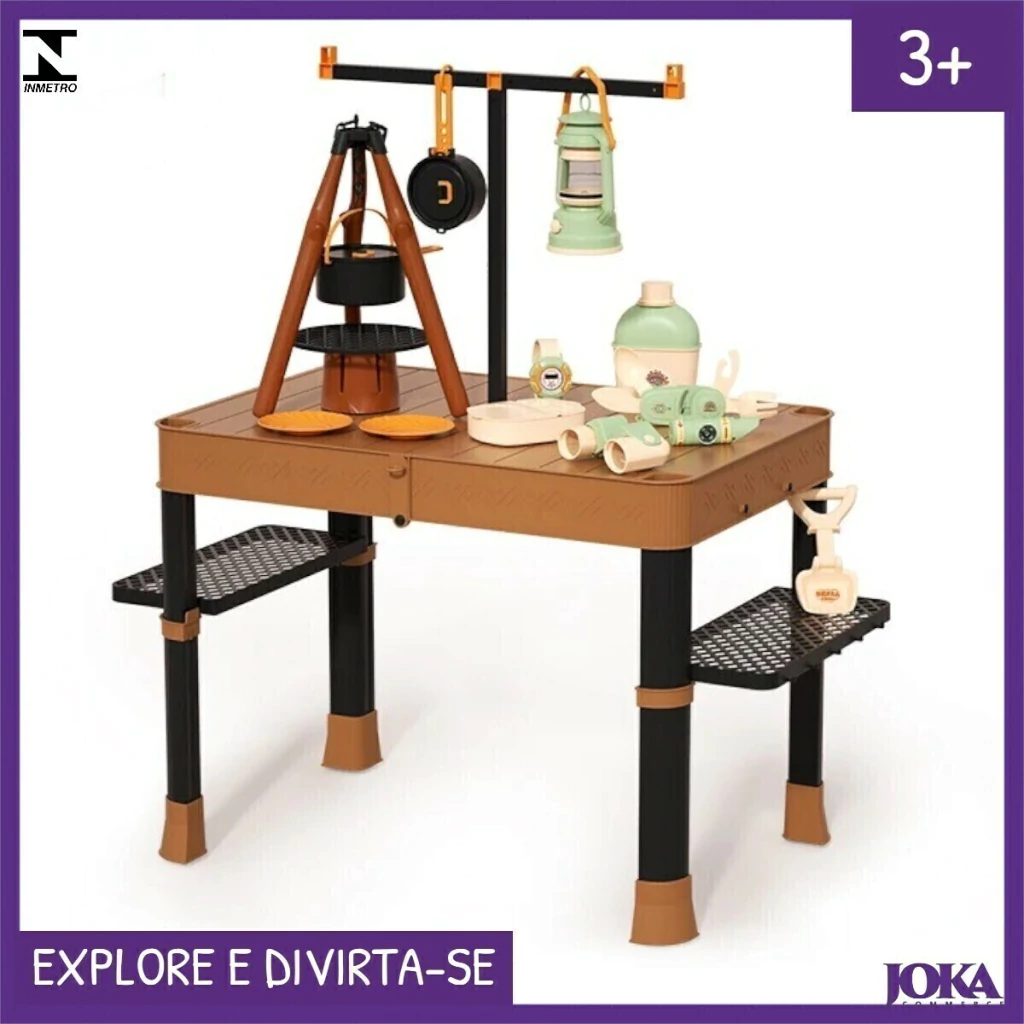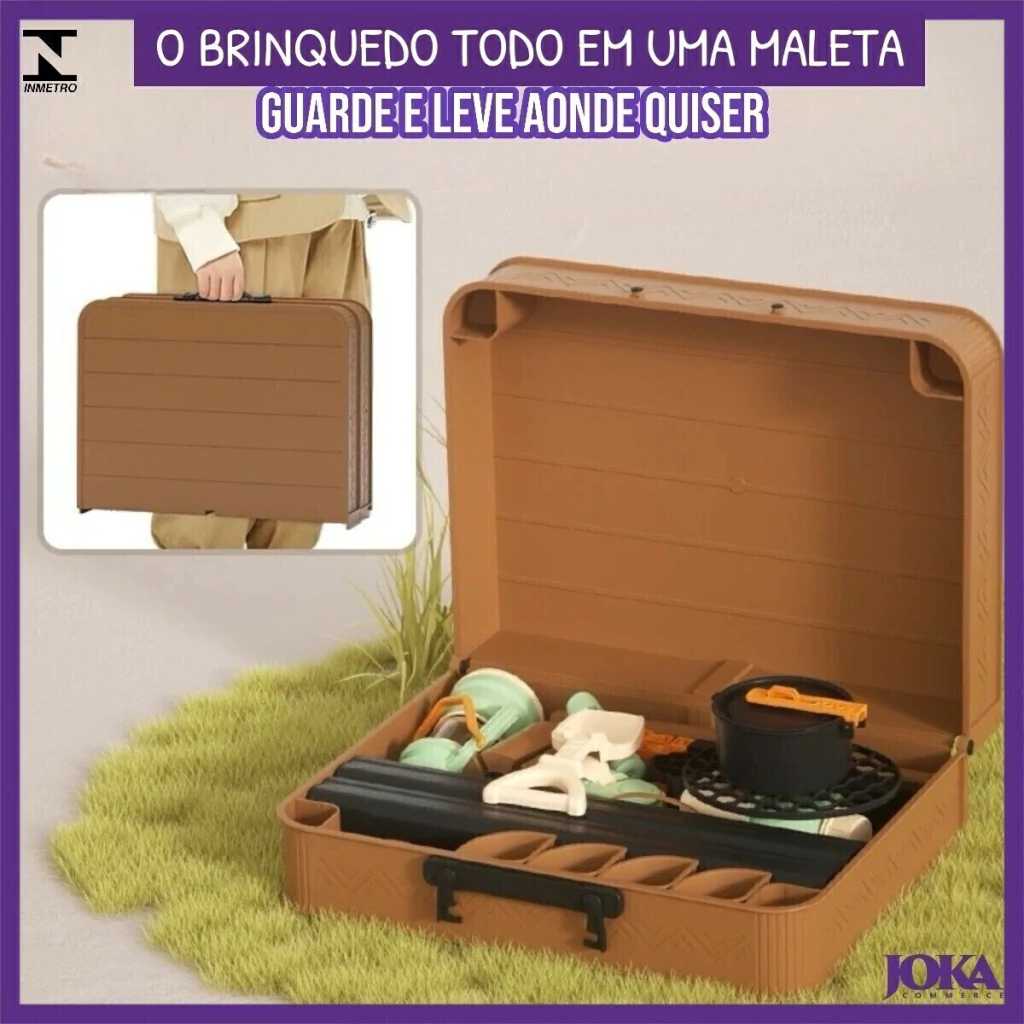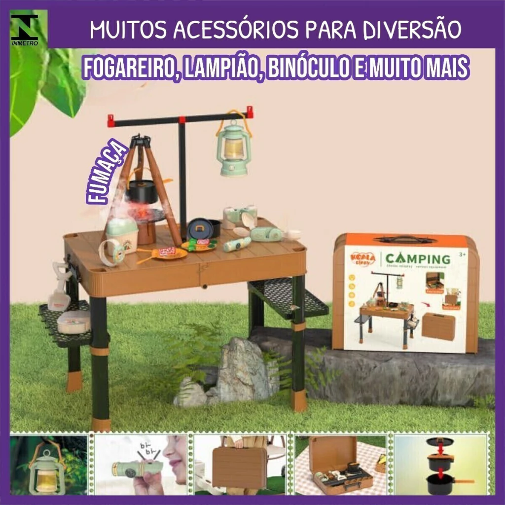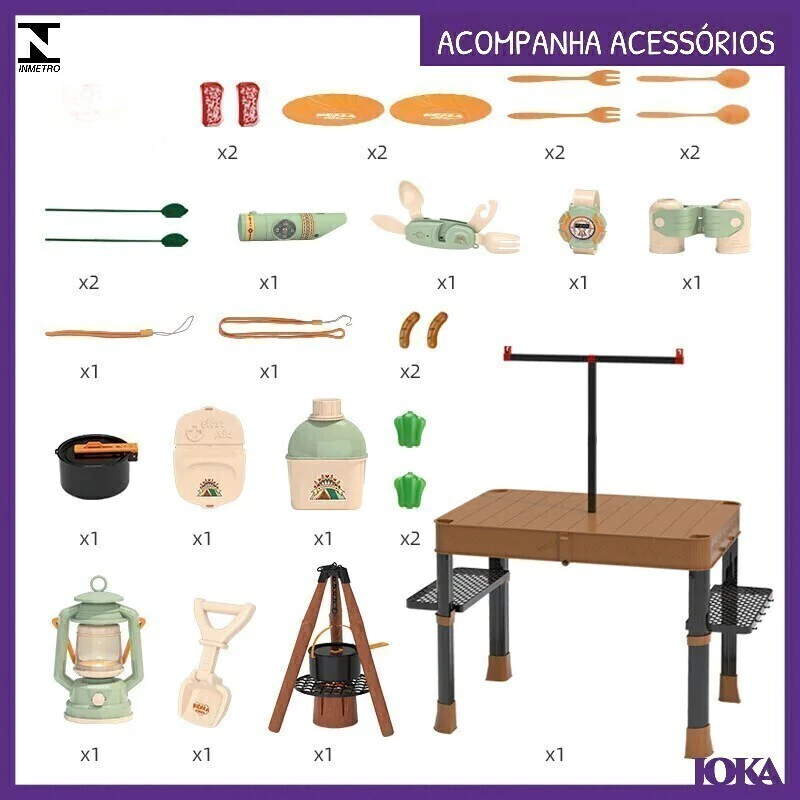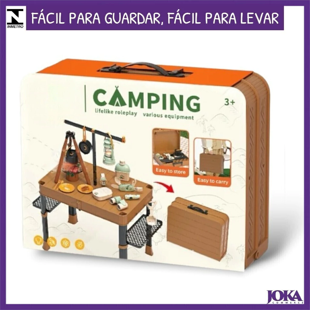 Com este conjunto de camping as crianças podem brincar de acampar, cozinhar em fogareiro, explorar a natureza com binóculos e lanternas, e compartilhar suas experiências com amigos e familiares. Este brinquedo oferece uma experiência de roleplay envolvente e educativa, que incentiva o desenvolvimento de habilidades motoras, sociais e cognitivas. A parte mais legal é que o brinquedo vai todo em uma maleta, não ocupando muito espaço.