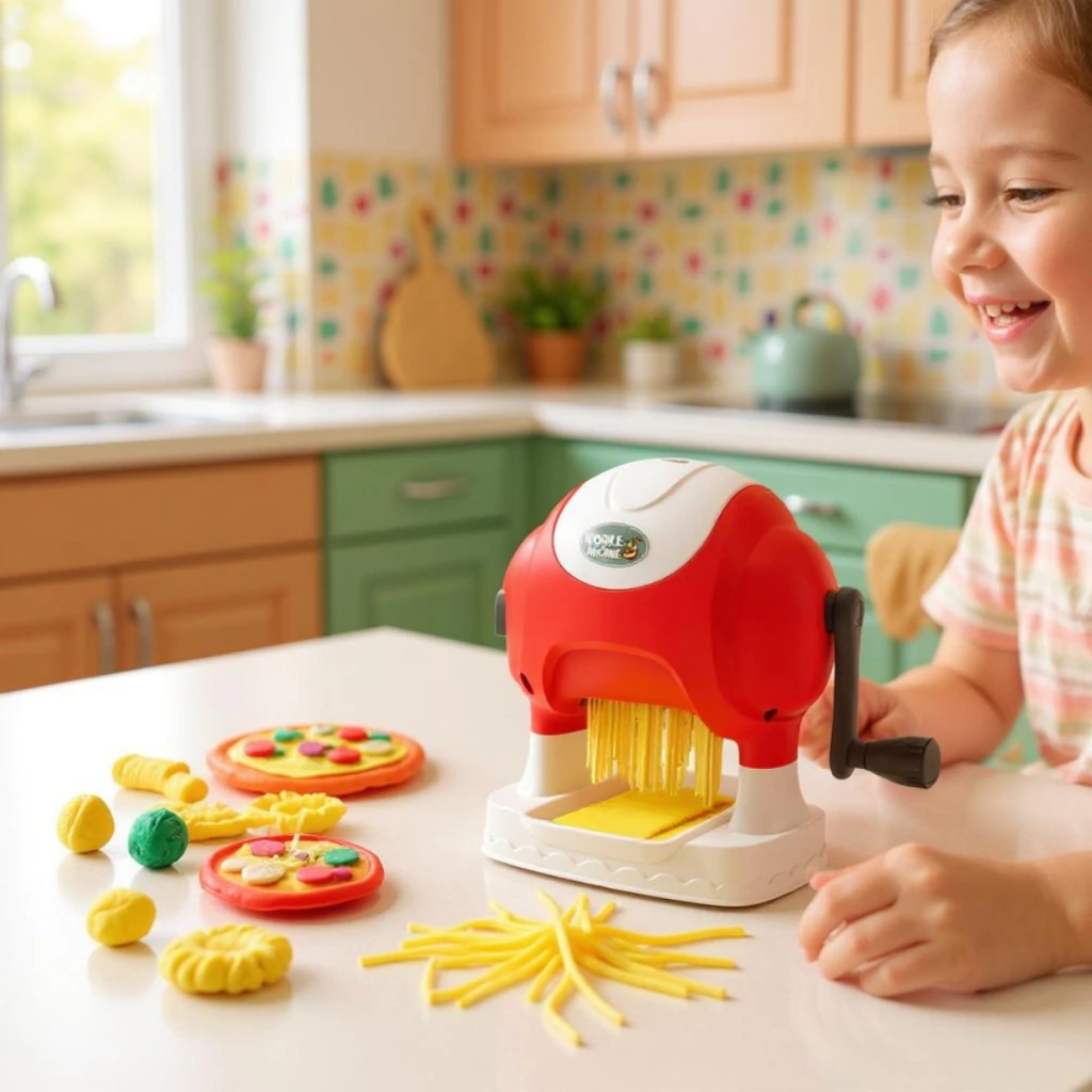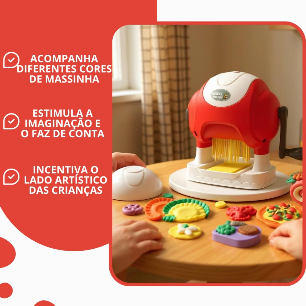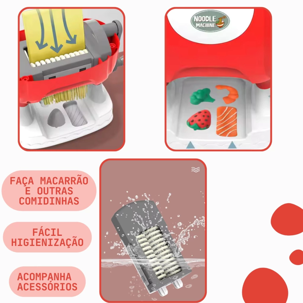 O brinquedo é muito semelhante a uma máquina de verdade, é possível passar a massinha e vê-la se transformando em macarrão, como espaguete ou talharim. As crianças adoram! E os adultos se divertem com elas também, além de ser uma forma criativa de entreter os pequenos enquanto preparam o jantar ou fazem tarefas em casa.