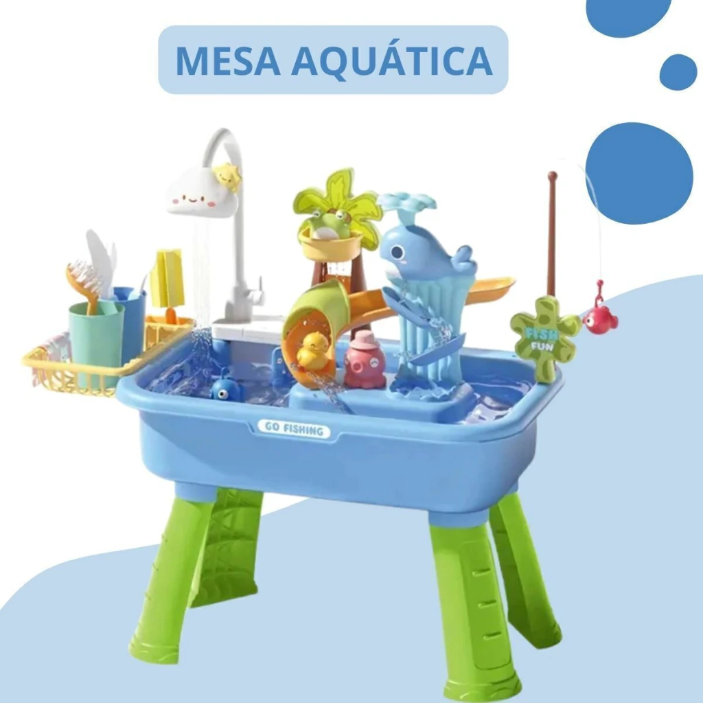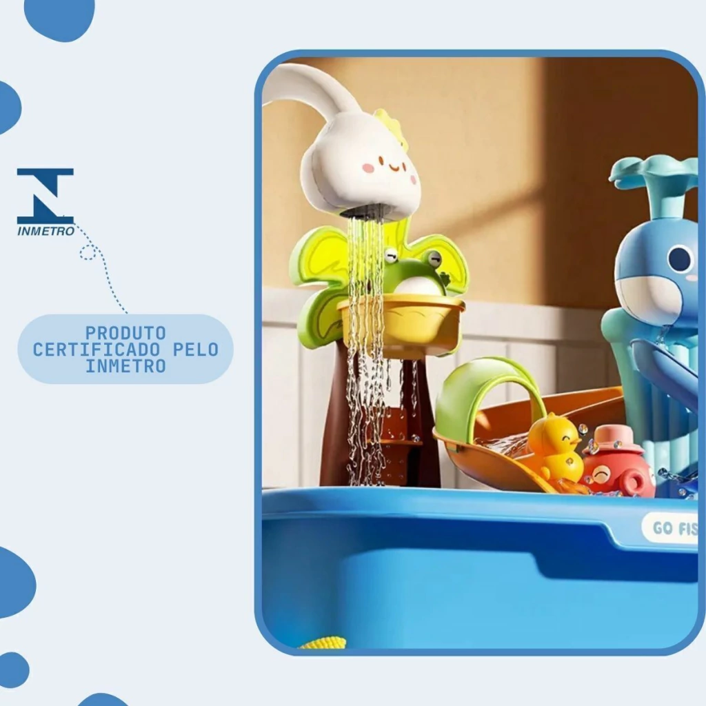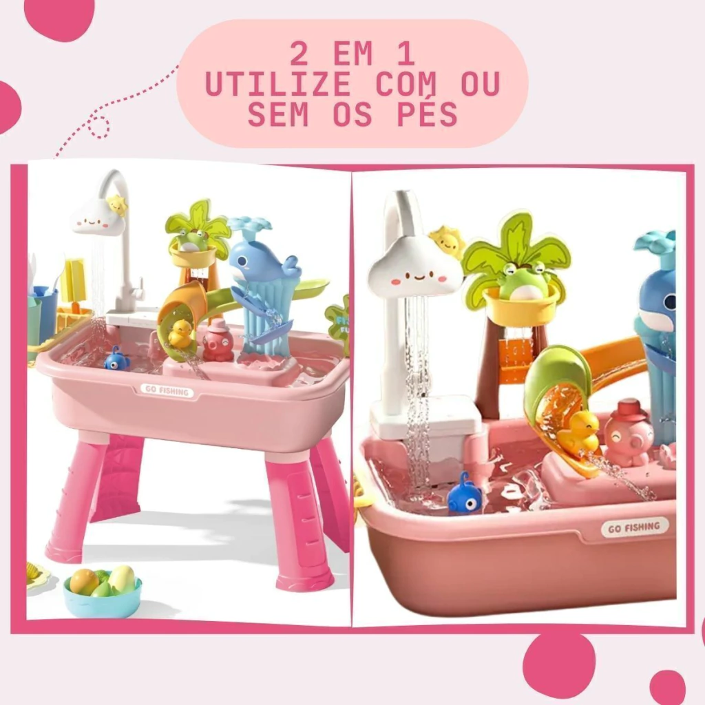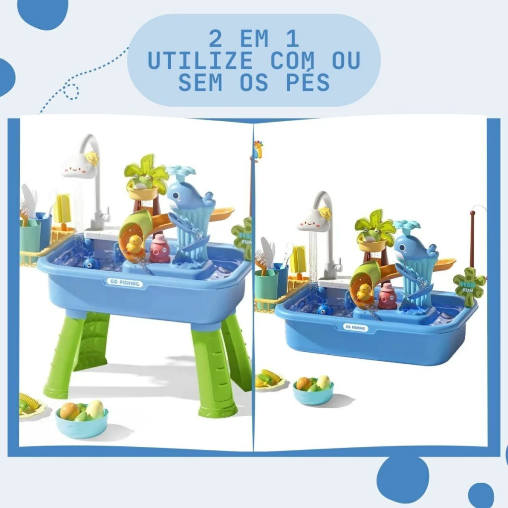 A Mesa Aquática Infantil 2 em 1 é diversão garantida para os pequenos! Pode ser usada com ou sem os pés, e vem equipada com torneira elétrica que jorra água de verdade, pescaria, tobogã de patinho e vários acessórios. Feita com plástico seguro e sem rebarbas, é ideal para estimular a coordenação motora, a criatividade e o faz de conta. Produto certificado pelo INMETRO e indicado para crianças a partir dos 3 anos. Disponível nas cores azul e rosa!