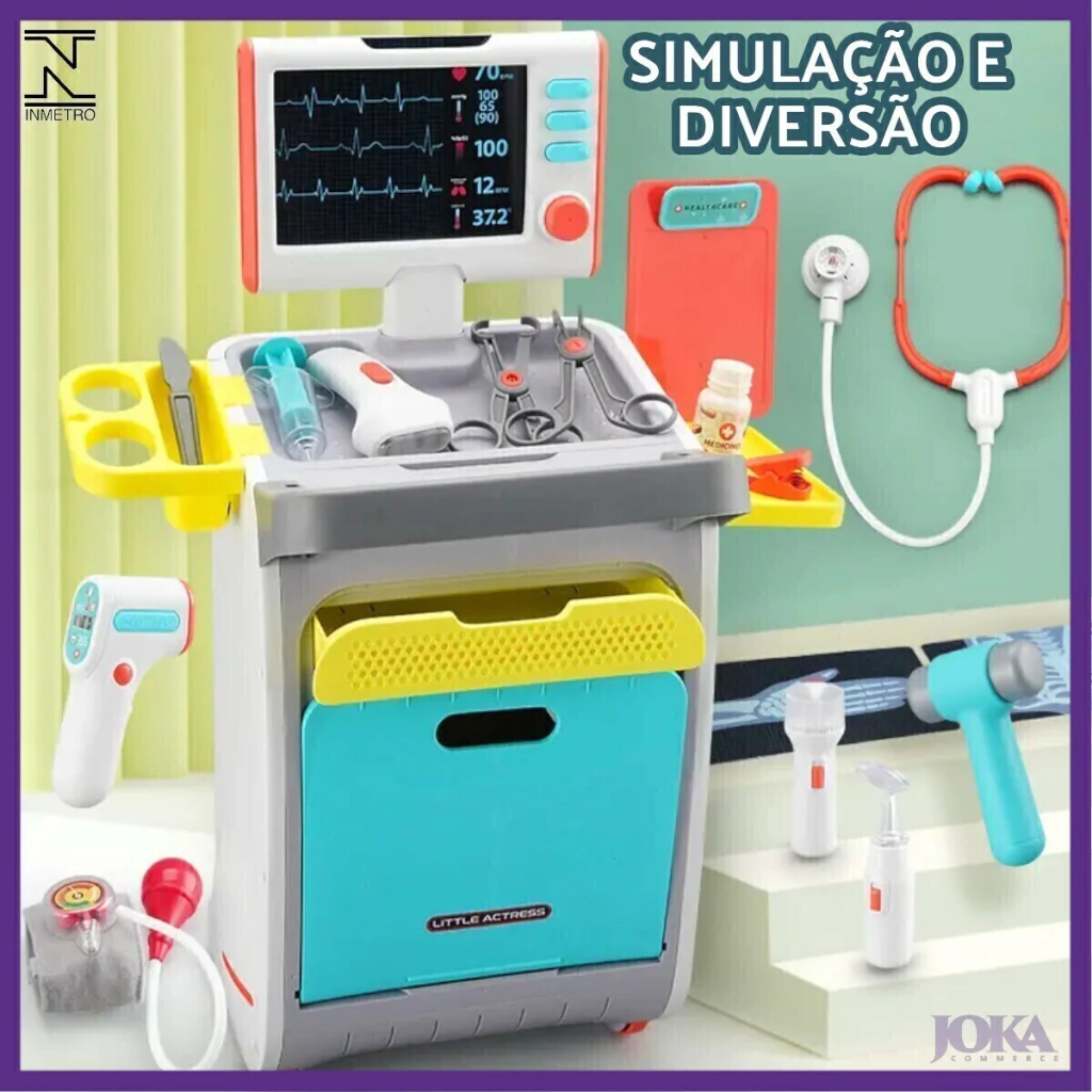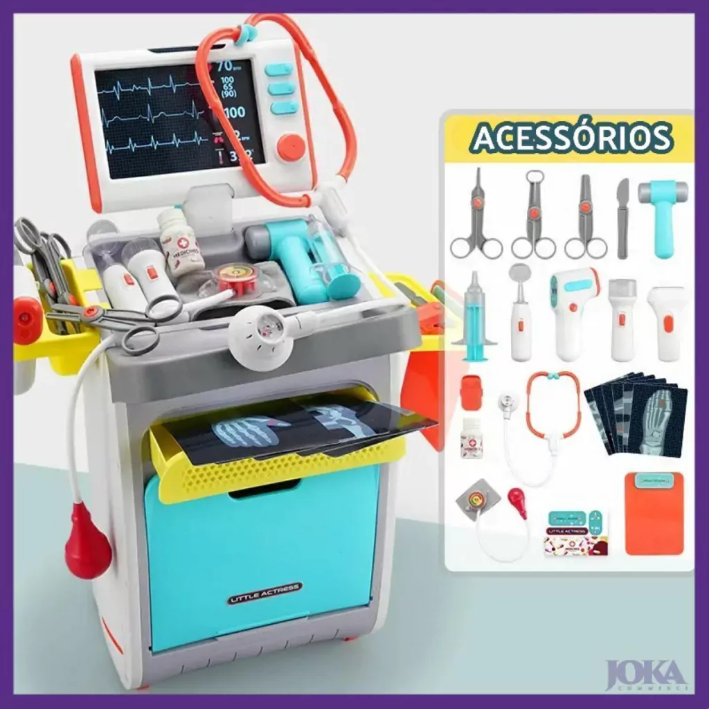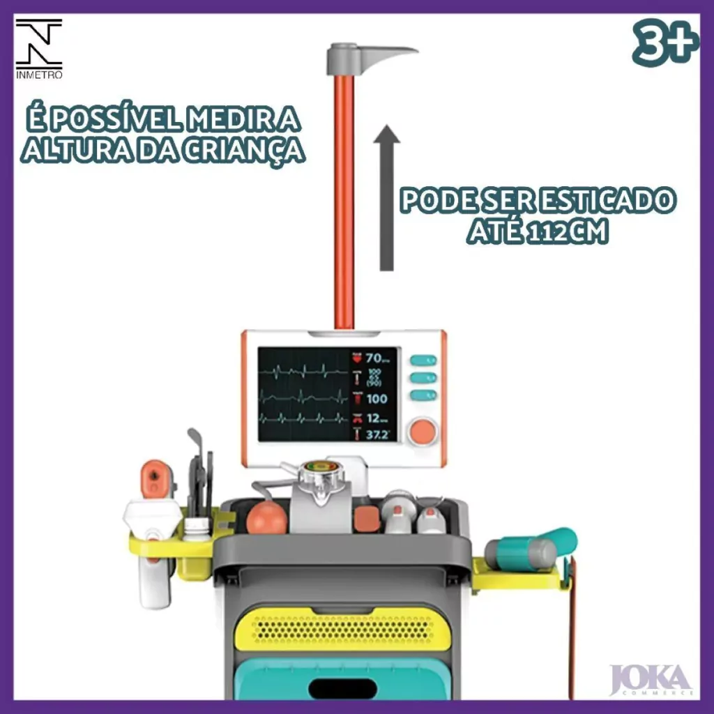 Este incrível carrinho médico oferece uma experiência interativa de brincadeira para crianças que adoram o mundo da medicina. Equipado com um monitor funcional com sons e luzes que simula os batimentos cardíacos, esse brinquedo educativo estimula o aprendizado de forma prática e envolvente. O carrinho possui diversos acessórios médicos, incluindo seringa, estetoscópio, termômetro, martelo de reflexo, além de um compartimento para guardar tudo organizado.