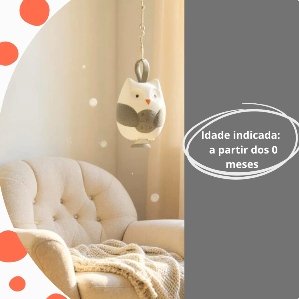 O Móbile Coruja é o companheiro perfeito para acalmar e entreter os bebês na hora do sono ou durante o dia. Possui uma alça de borracha resistente e flexível, ideal para prender em berços, carrinhos ou em qualquer lugar. O móbile conta com um botão temporizador com três opções de tempo (15, 30 ou 60 minutos), controle de volume, botão liga/desliga e também um botão para selecionar diferentes músicas e sons.