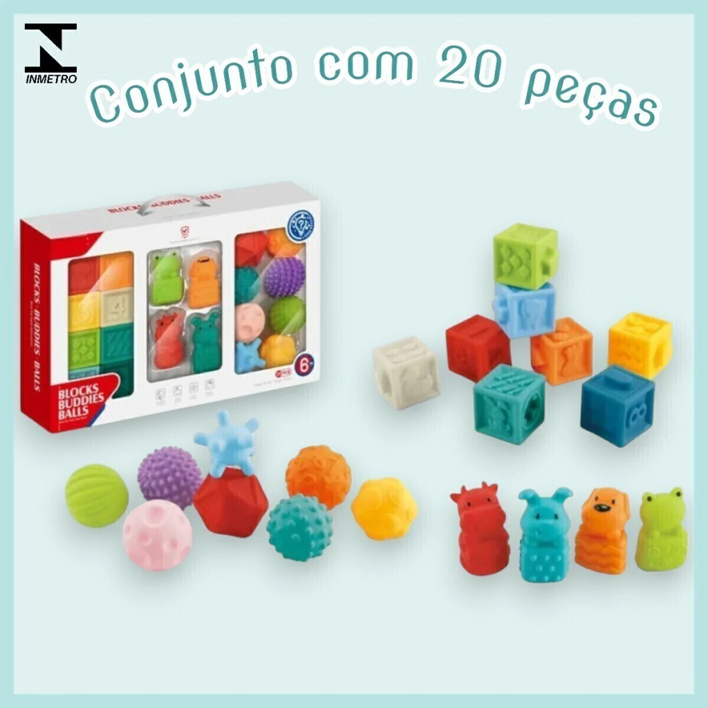 Este conjunto incrível inclui uma variedade de peças coloridas e texturizadas, perfeitas para estimular o desenvolvimento sensorial e motor das crianças. Com blocos de encaixe, animais adoráveis e bolinhas sensoriais, o kit oferece múltiplas formas de brincar e aprender.