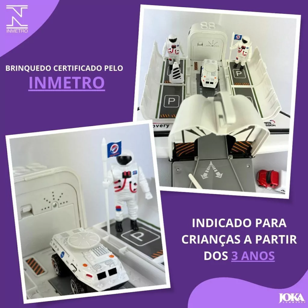 Este incrível brinquedo educativo transporta as crianças para o mundo da exploração espacial! Com design inspirado em uma Nave Espacial, este brinquedo inclui uma variedade de peças como astronautas, veículos e sinais de trânsito que simulam um cenário de pouso lunar. A nave possui uma pista, aonde a criança pode brincar e se divertir com os carrinhos que acompanham o produto.