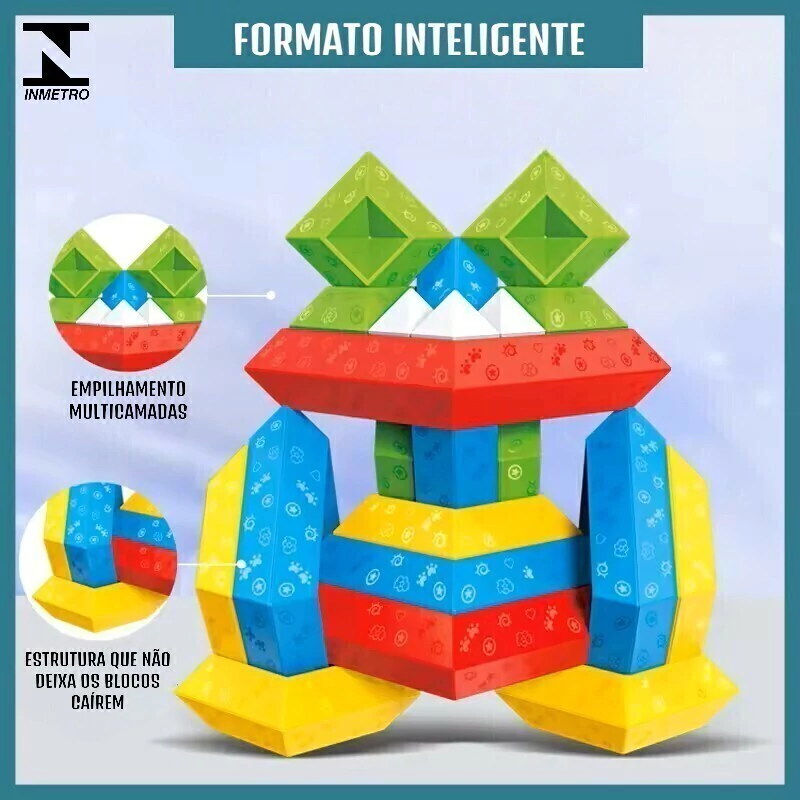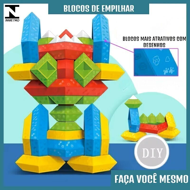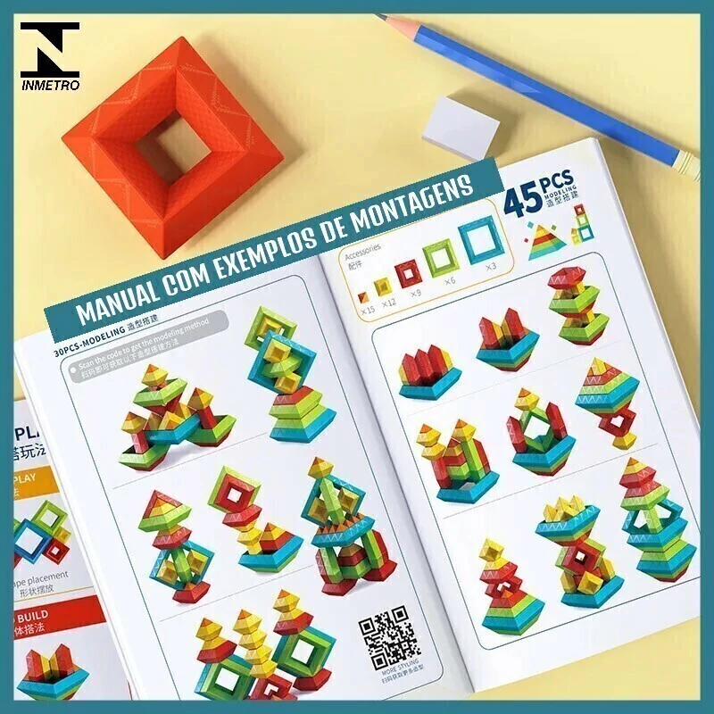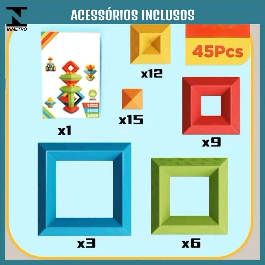 Blocos Geométricos de Encaixe com 45 peças, feitas de ABS, esses blocos possuem um encaixe perfeito que garante que as peças não se soltem, mas são fáceis de montar. São do estilo "faça você mesmo", permitindo que a criança crie diversas formas e estruturas conforme a imaginação. O brinquedo vai acompanhado de uma manual, para ajudar a criança com novas ideias de montagem.