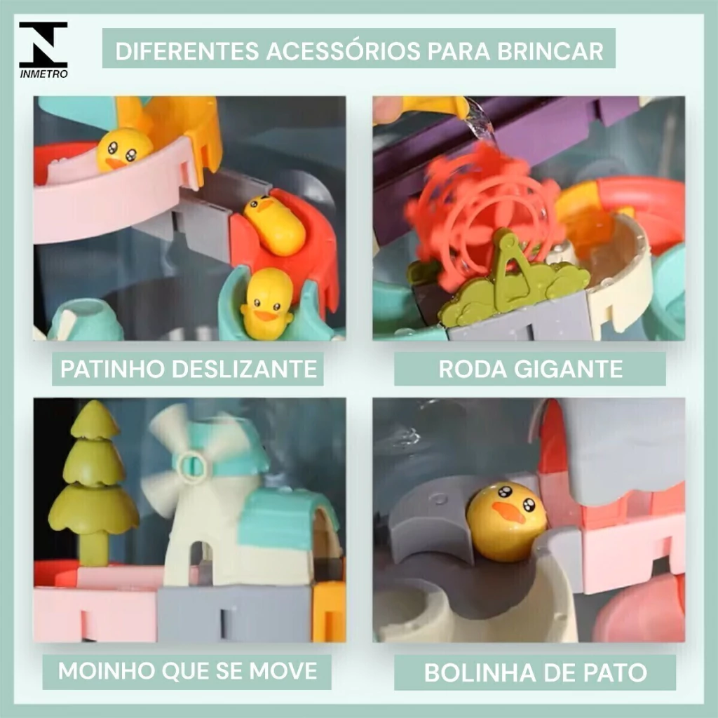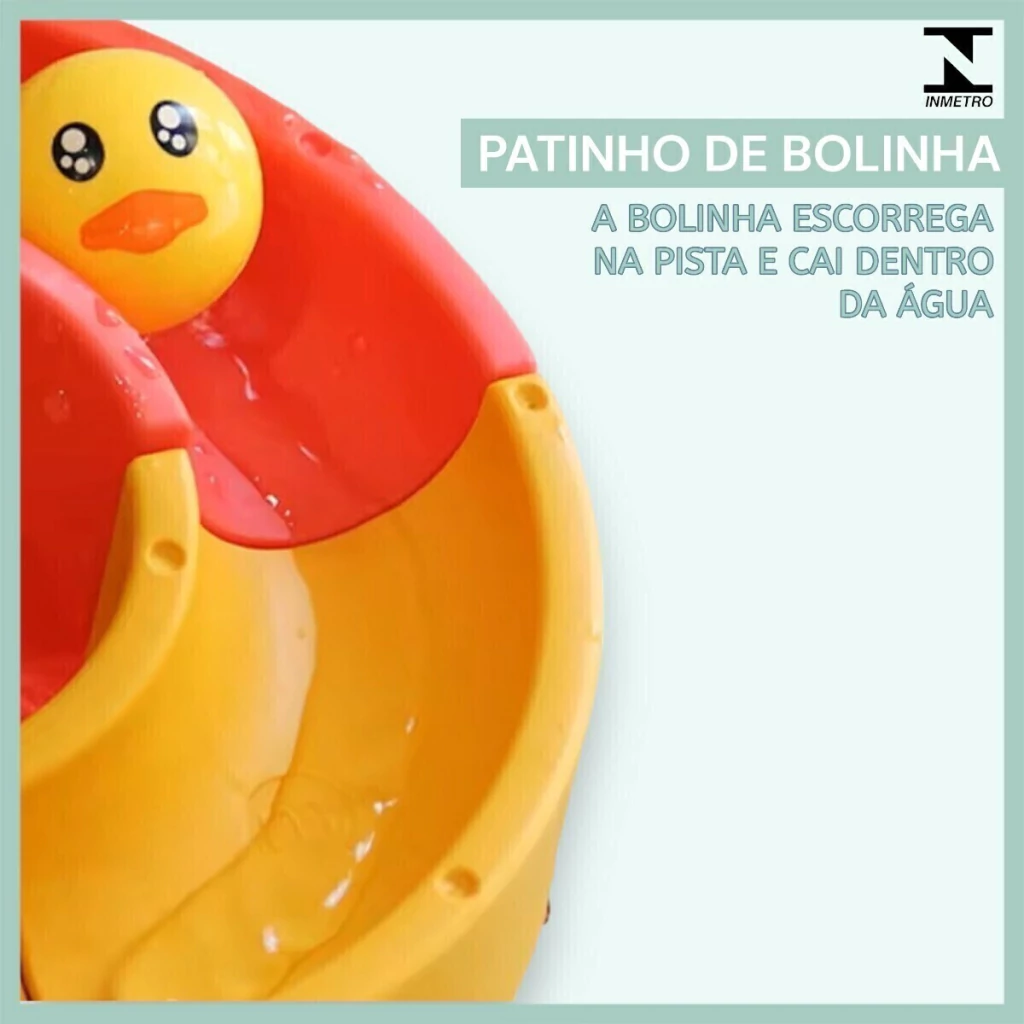 A pista acompanha bolinhas e patinhos que deslizam pela pista, proporcionando diversão neste momento que muitas vezes não é muito desejado pelas crianças.