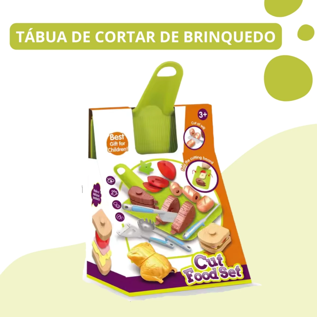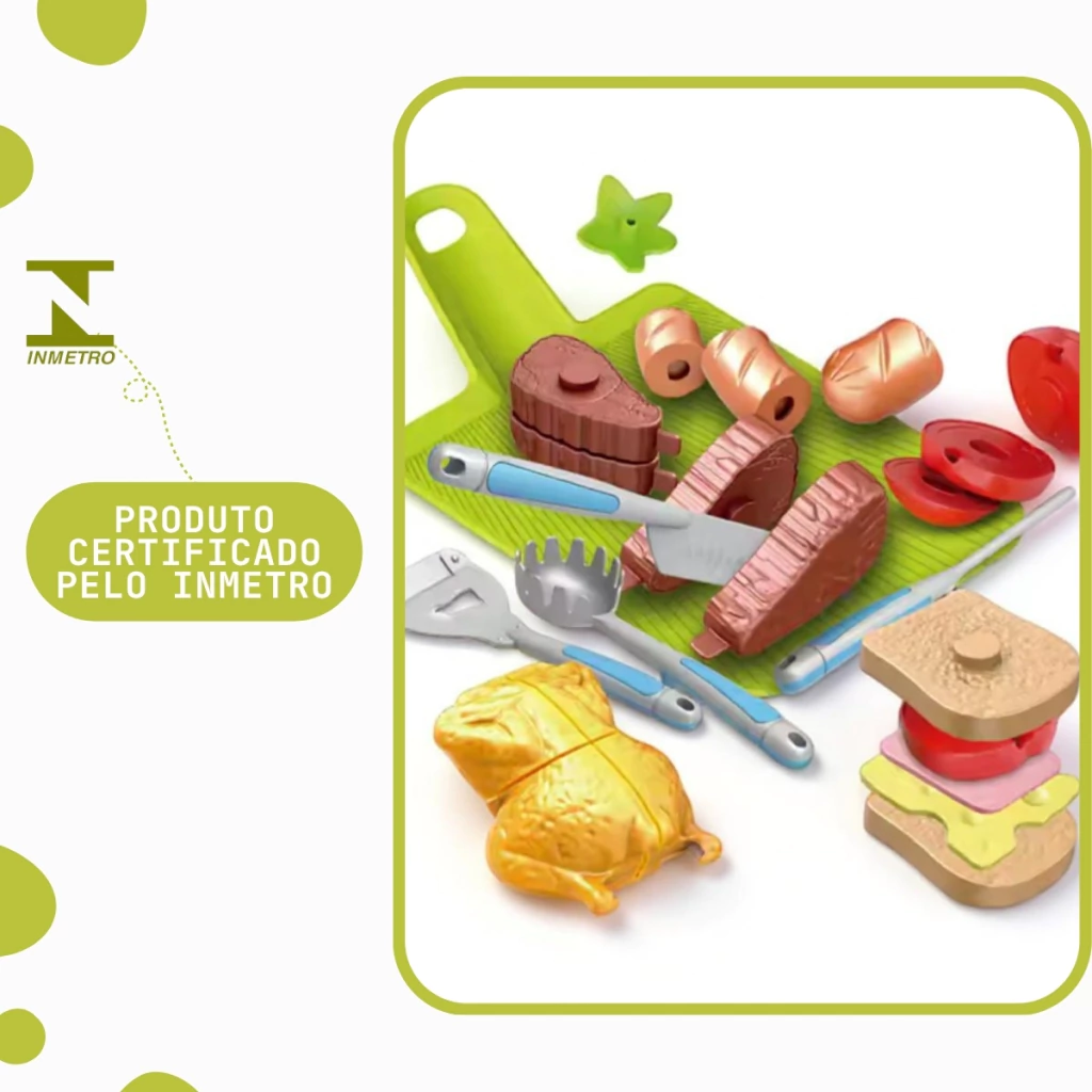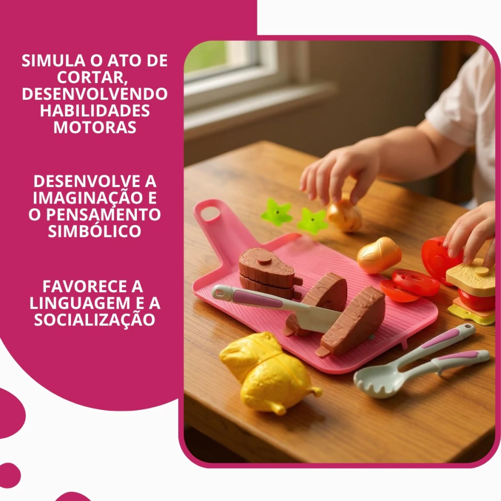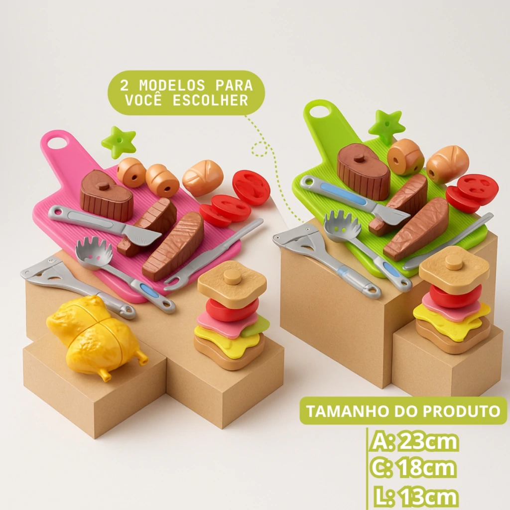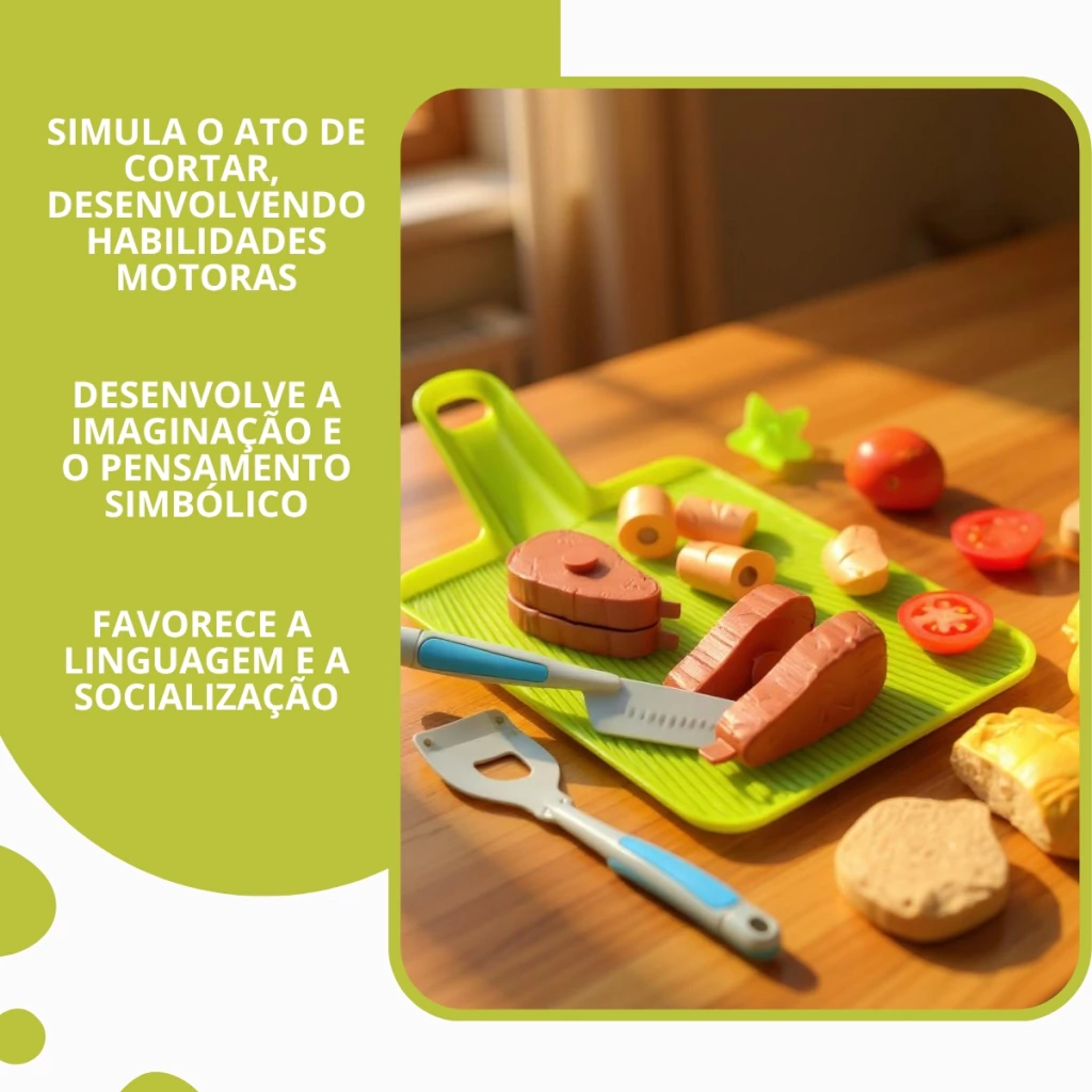 Este kit de alimentos de corte é ideal para crianças que adoram brincar de cozinhar. Acompanha alimentos que simulam carnes, legumes, pães e lanches, além de uma tábua e uma faca de brinquedo. Os alimentos se encaixam facilmente.