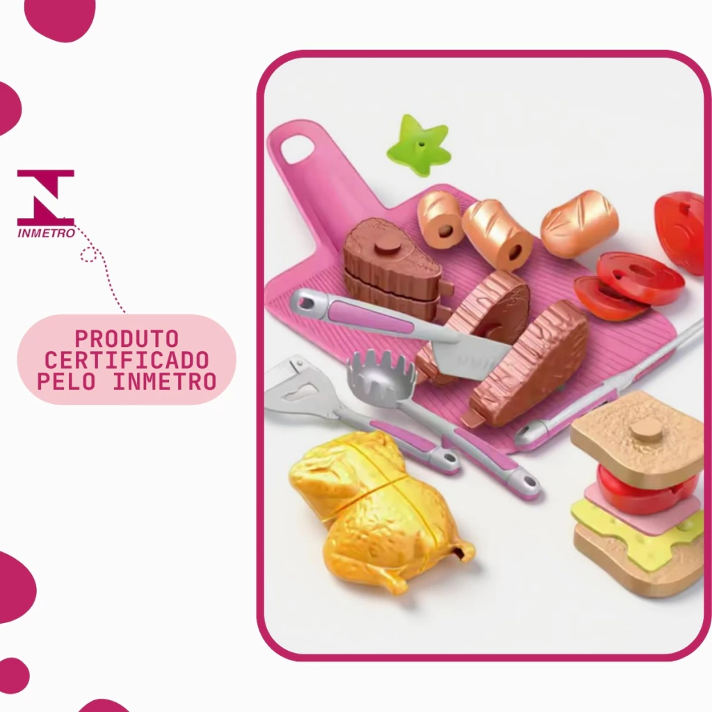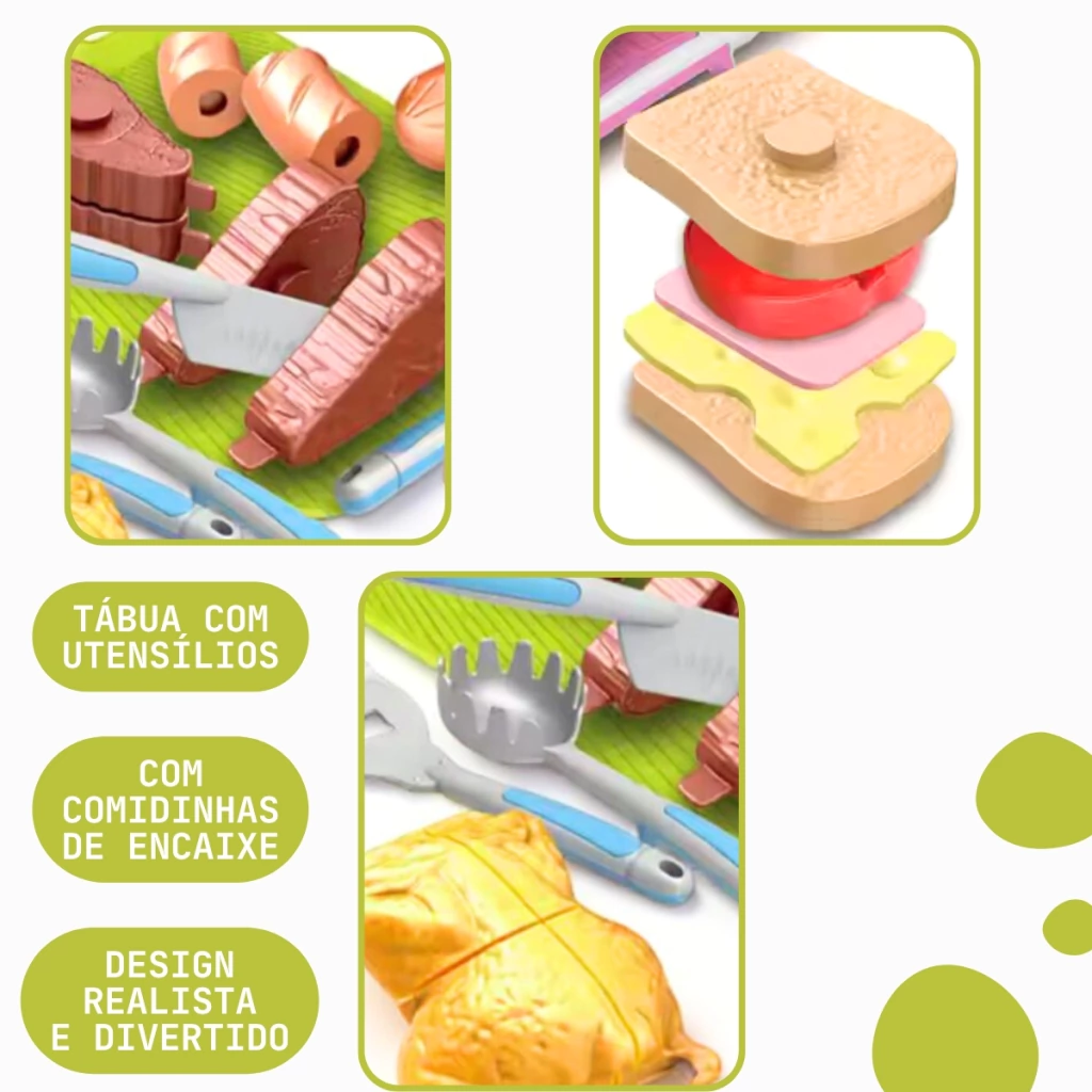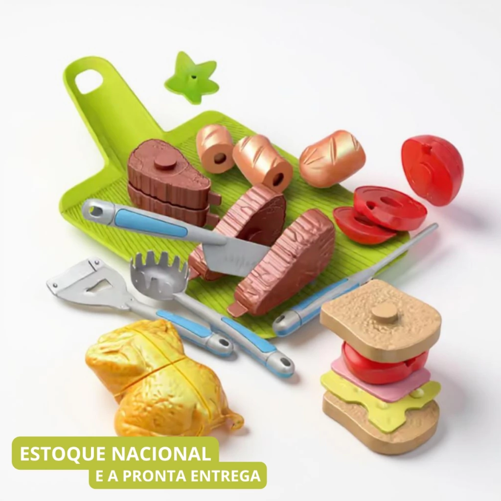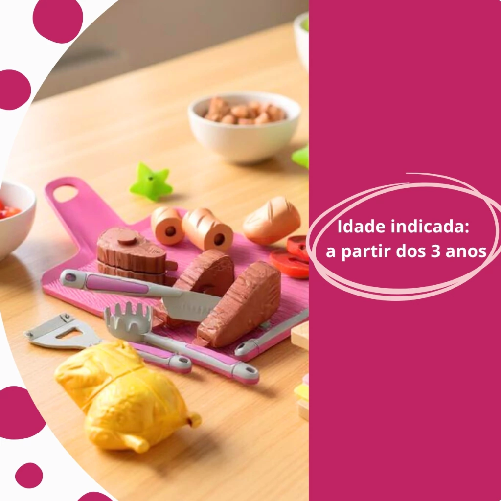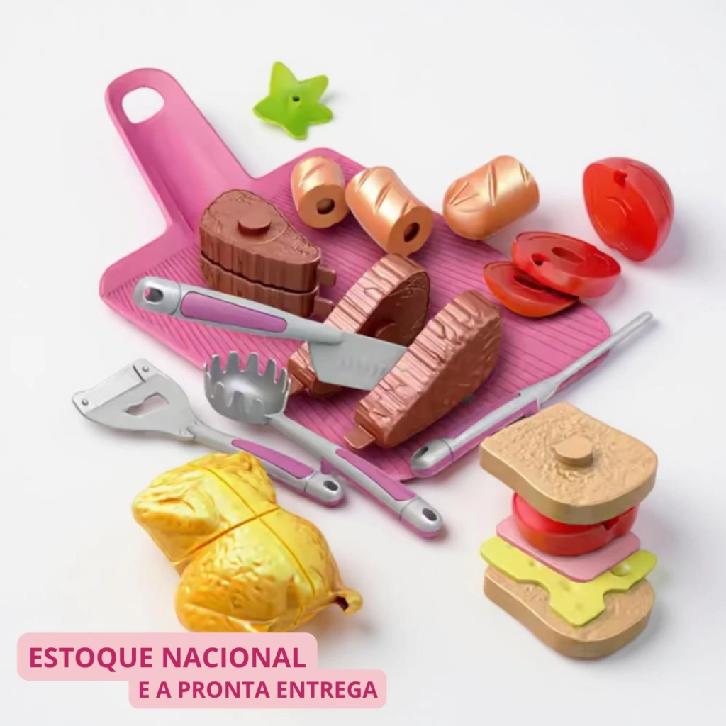 Este kit de alimentos de corte é ideal para crianças que adoram brincar de cozinhar. Acompanha alimentos que simulam carnes, legumes, pães e lanches, além de uma tábua e uma faca de brinquedo. Os alimentos se encaixam facilmente.