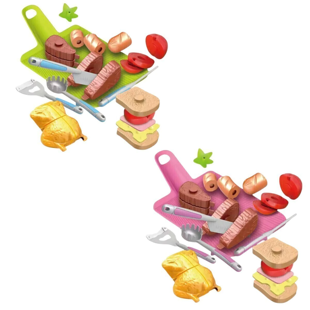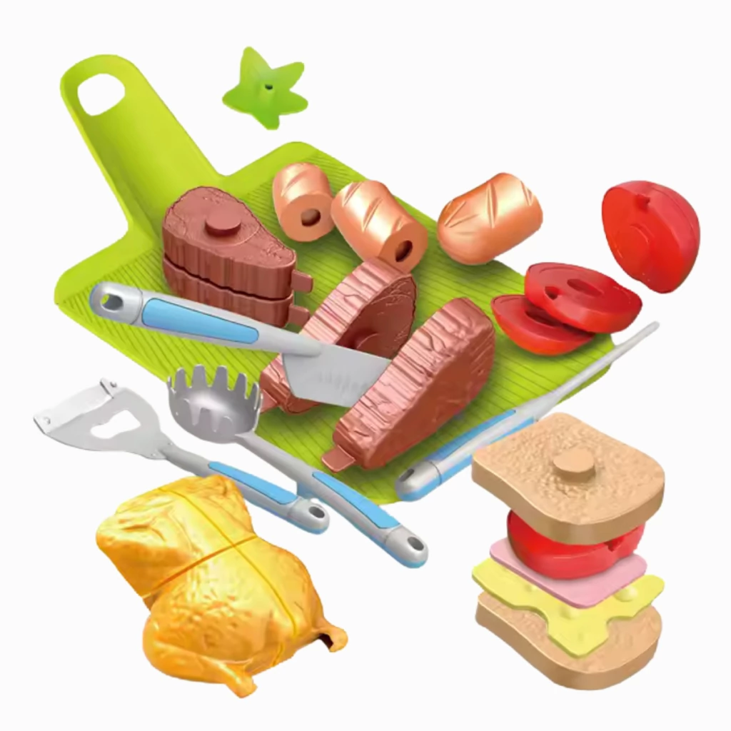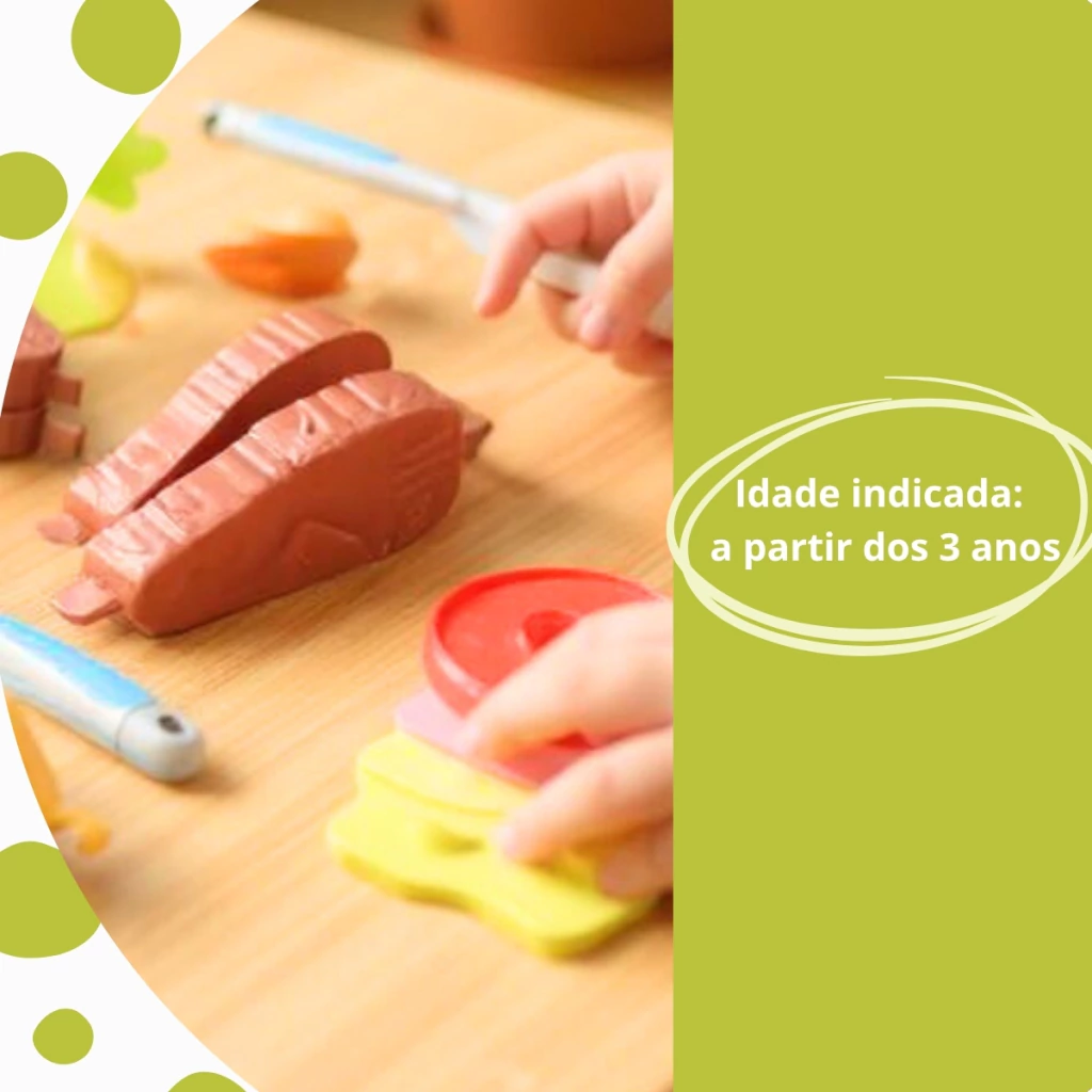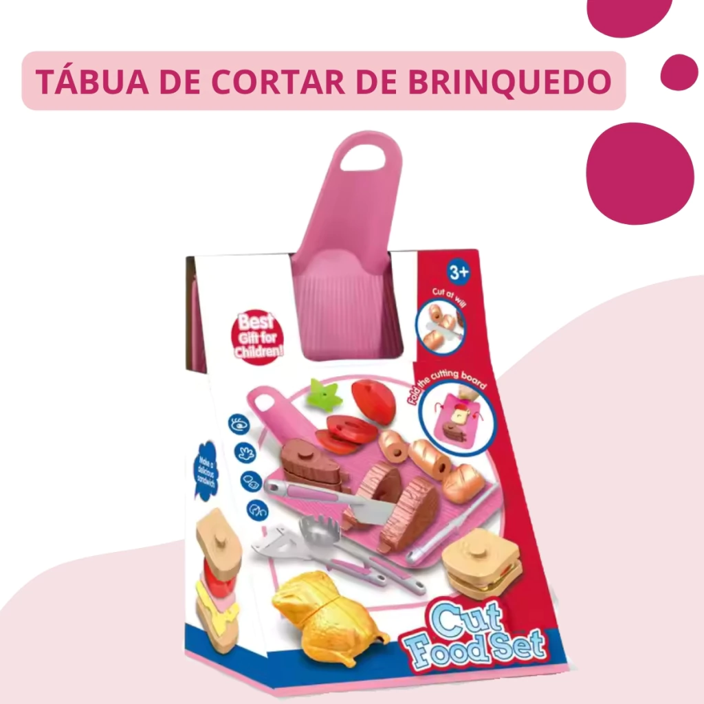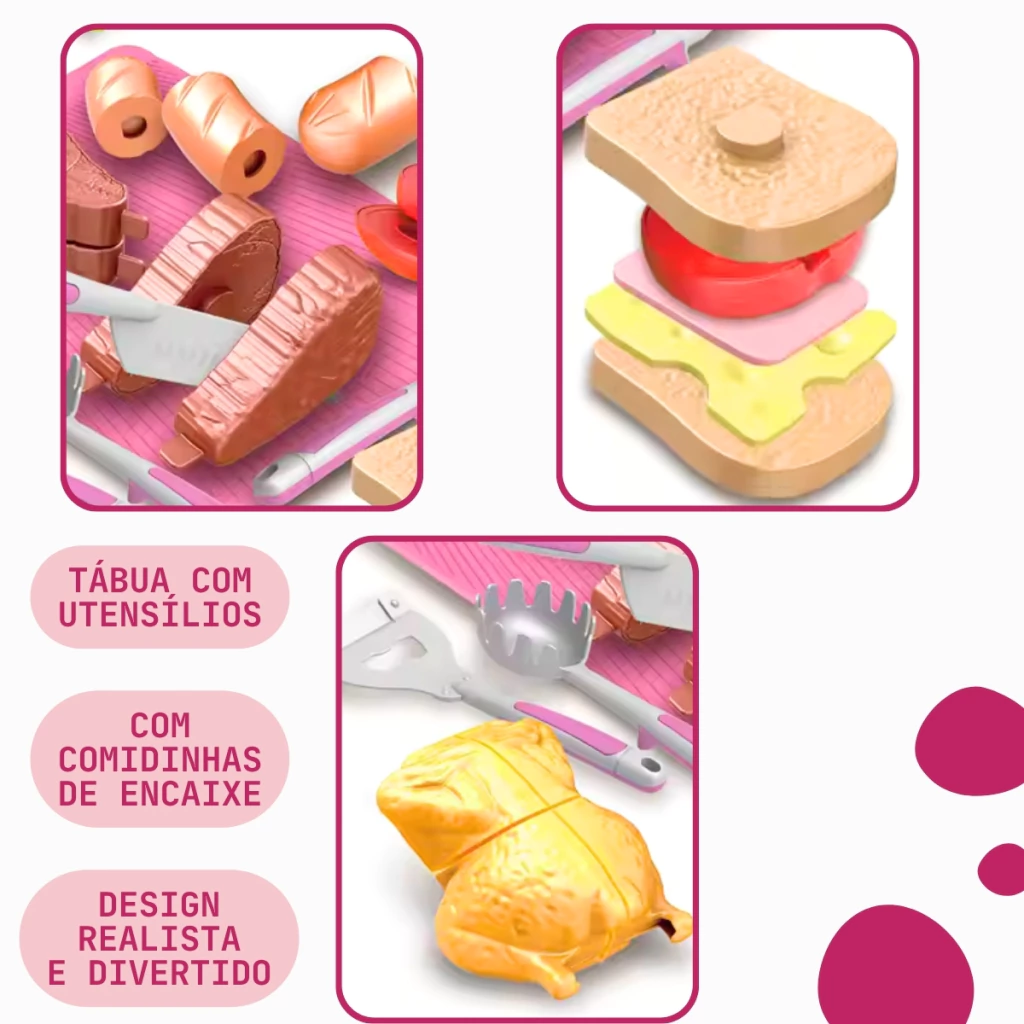 Este kit de alimentos de corte é ideal para crianças que adoram brincar de cozinhar. Acompanha alimentos que simulam carnes, legumes, pães e lanches, além de uma tábua e uma faca de brinquedo. Os alimentos se encaixam facilmente.