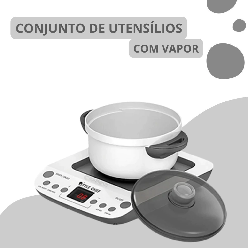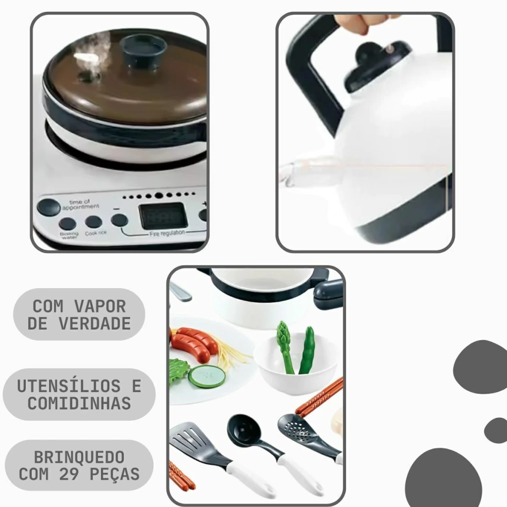 - Faz barulho e uma das panelinhas solta fumaça de verdade;